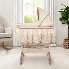 More details Features Retractable/locking swivel castors for easy portability and convenience, Mattress pad, sheet and bassinet skirt included, This item is eligible for free replacement parts. Contact Amazon Customer Service for more information., Meets all JPMA safety standards, some assembly required, Variable speed vibration unit with adjustable sound music and night light to lull your little one to sleep, Extra large 18 x 34" frame for the ultimate in comfort, large mesh basket under bassinet for ample storage of all things baby Gender Unisex Assembled Product Weight 13 lb Manufacturer Part Number 35201-270 Color Other, Beige Manufacturer Delta Children Model 35201-270 Assembled Product Dimensions (L x W x H) 35.00 x 29.00 x 44.00 Inches Product details The adorable Rocking Bassinet by Delta Children is perfect for keeping your little one close to you during the early months. It features a jungle-inspired design theme with soft, neutral colors. As beautiful as it is practical, Delta Children's Rocking Bassinet in Playtime Jungle features two plush toys hanging from the canopy and an electronic pod that will lull little ones to sleep with soothing music, gentle vibration, and a soft nightlight. Its rocking base adds another layer of comfort-activate the rocking motion with a gentle push. Wheels make it easy to move this beige baby rocking bassinet from room to room. A large mesh storage basket provides ample space to store all your baby essentials. This Delta baby bassinet comes with a mattress pad and matching sheet. For use by children weighing less than 15 lbs Beige baby rocking bassinet with jungle theme Activate the bassinet's rocking motion with a gentle push Delta baby bassinet features an electronic pod that has music, night-light and vibration Mesh storage basket Includes mattress pad, sheet and bassinet skirt Retractable, locking swivel wheels Requires 4 AA batteries (not included) Product weight: 16.5 lbs