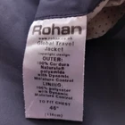 Gently used condition with no faults found. Blue colour cordura fabric practical and smart travel jacket from Rohan. Lined. Zipped inner pockets. 2 button front, single button at cuff. Measures 22" shoulder to shoulder, 27" pit to pit, 32" nape to hem, 25" sleeve.