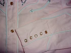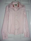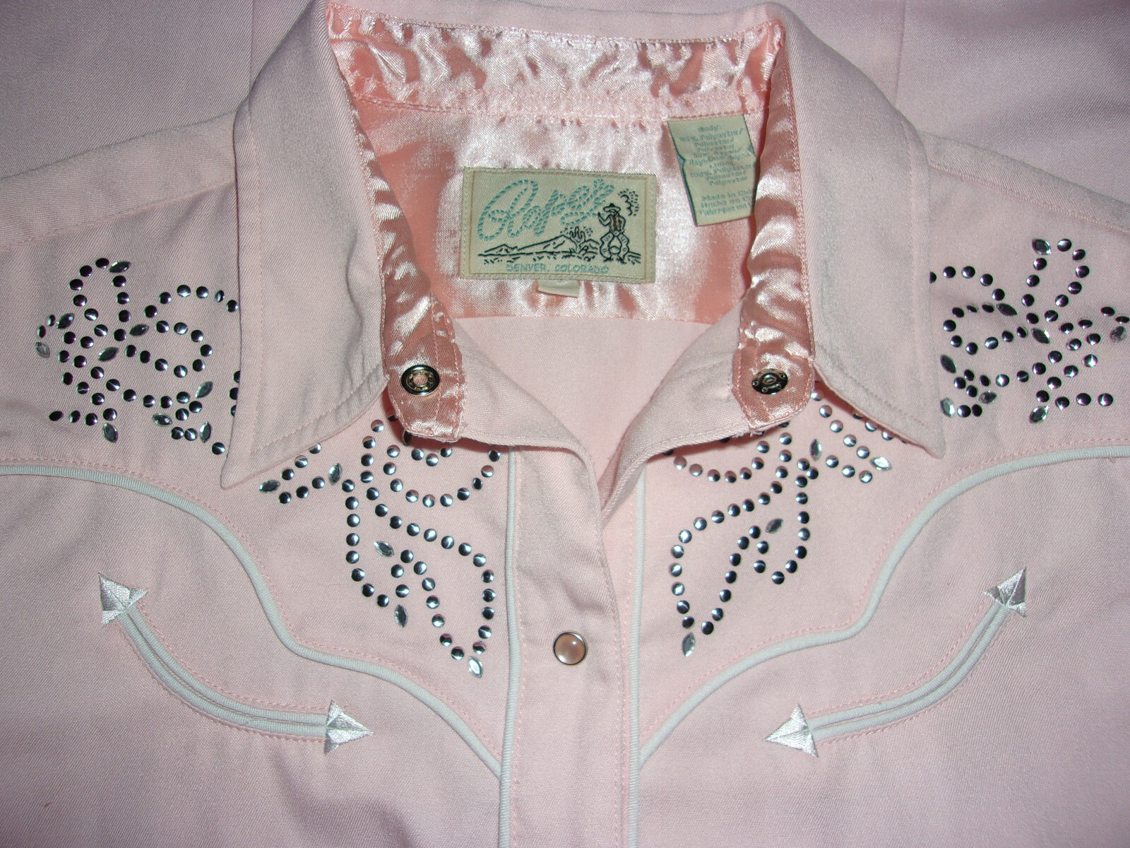 WELCOME AND THANK YOU FOR SHOPPING WITH ME! This offer is for a women's western shirt by Roper, Denver, Colorado, in light pink with white piping, pink snaps, vintage look details and applied silver "bling" studs. The fabric is 65% poly and 35% rayon in a medium-weight twill (machine washable). This shirt features long sleeves with fitted cuffs adorned with 5 snaps and piping. There are darts front and back for a flattering fit and a shirttail hem. A women's size Large - before submitting an offer, please compare your own to these approximate measurements: Bust, 42".................Shoulder, 17".....................Sleeve Length, 26"................Waist area, 37"..............Length, 26" (in back, from mid-shoulder) .. Note: Check out my store for more great unique western items! IMPORTANT: I am very selective in my purchases and my intention is to offer only the best of merchandise, whether it is new, used or vintage. I try very hard to find and disclose any defects or imperfections. If I should miss something, please contact me right away. Customer satisfaction is my #1 priority! Please check clothing measurements carefully and allow up to 2 inches for comfort room or an item may be too snug. I use EBay shipping labels which include tracking numbers. My home is smoke and pet free. NEXT DAY SHIPPING! ~~~A HEARTFELT THANK YOU TO ALL MY LOYAL CUSTOMERS FOR YOUR GREAT EMAILS, FEEDBACK AND CONTINUED PATRONAGE! YOU ARE THE BEST~~~ Check out my other items Be sure to add me to your favorites list ! ~~~I will recycle shipping/packing materials whenever possible. This saves you money and helps protect our environment~~~