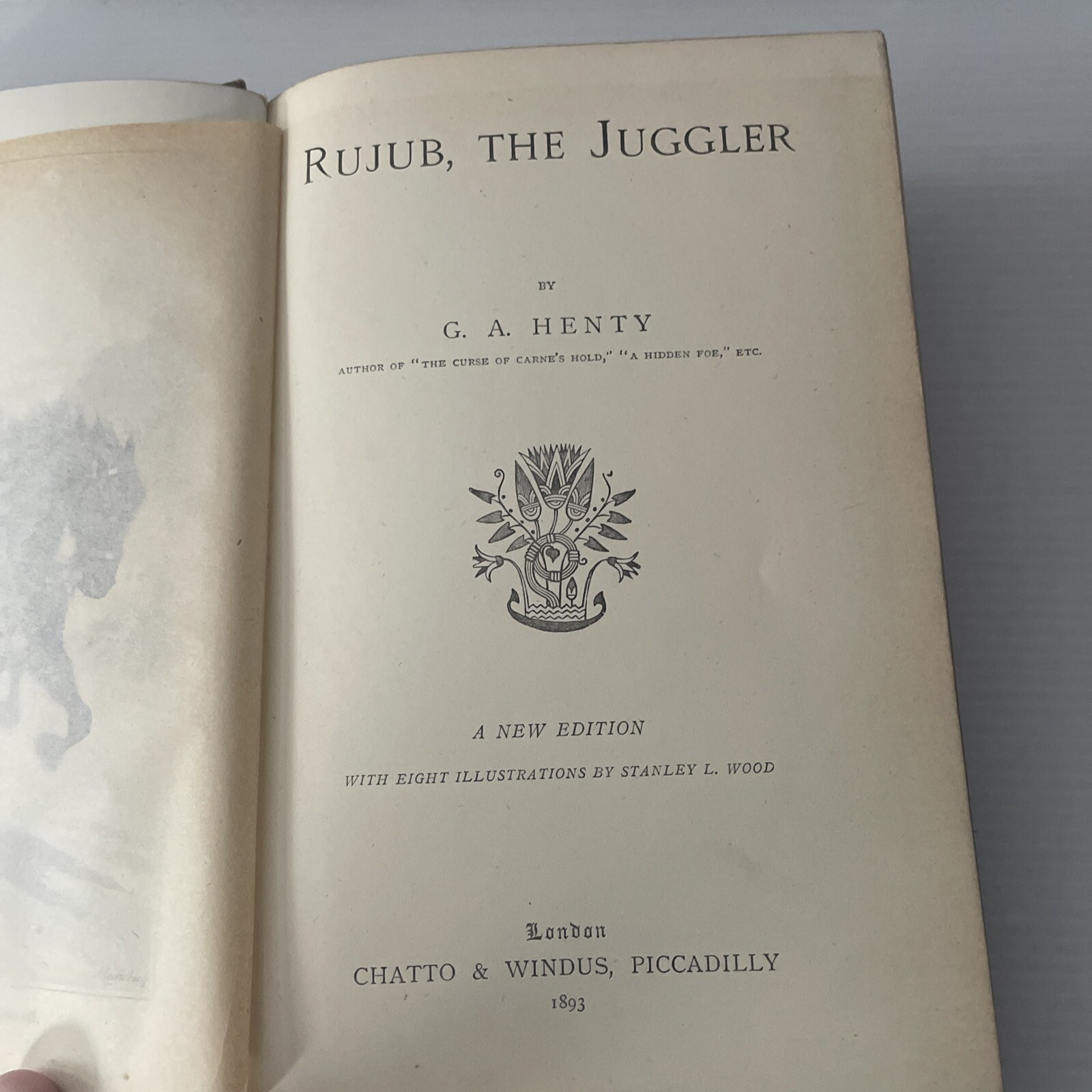 Rujub the Juggler G. A. Henty 1893 First edition, of this Samuel Wood-illustrated edition. With Pictorial cover & spine and 8 illustrations. Advertisements to rear showing date of July 1893 Chatto & Windus - Piccadilly London Set during the First Anglo-Afghan War (1839–1842). It follows the journey of a young British officer, William Gale, who is sent on a mission to Herat and Cabul (modern-day Kabul) amid the backdrop of political intrigue and military conflict. Henty's narrative weaves together adventure, danger, and historical events, showcasing his talent for bringing historical periods to life. The novel highlights the challenges and complexities faced by the British and their allies during this tumultuous time in Afghan history. G.A. Henty was a prolific English author and war correspondent, best known for his historical adventure stories, especially those geared towards young readers. Born in 1832, Henty wrote over 100 books, each with vivid historical settings and thrilling narratives. His works often featured young protagonists overcoming significant challenges and providing a look into various historical periods and events. Condition: VINTAGE GOOD - Photo's of Actual Product - See photos to confirm condition A ll pages present and a fully intact cover. Shows significant wear, including wear to the boards & textblock. Binding in tact, decorative pictorial cover and spine. Tanning & foxing. Slant to spine. ------------------- Please See my eBay shop for more Modern & Vintage Books Add as a favourite seller, new stock added daily Thanks for looking