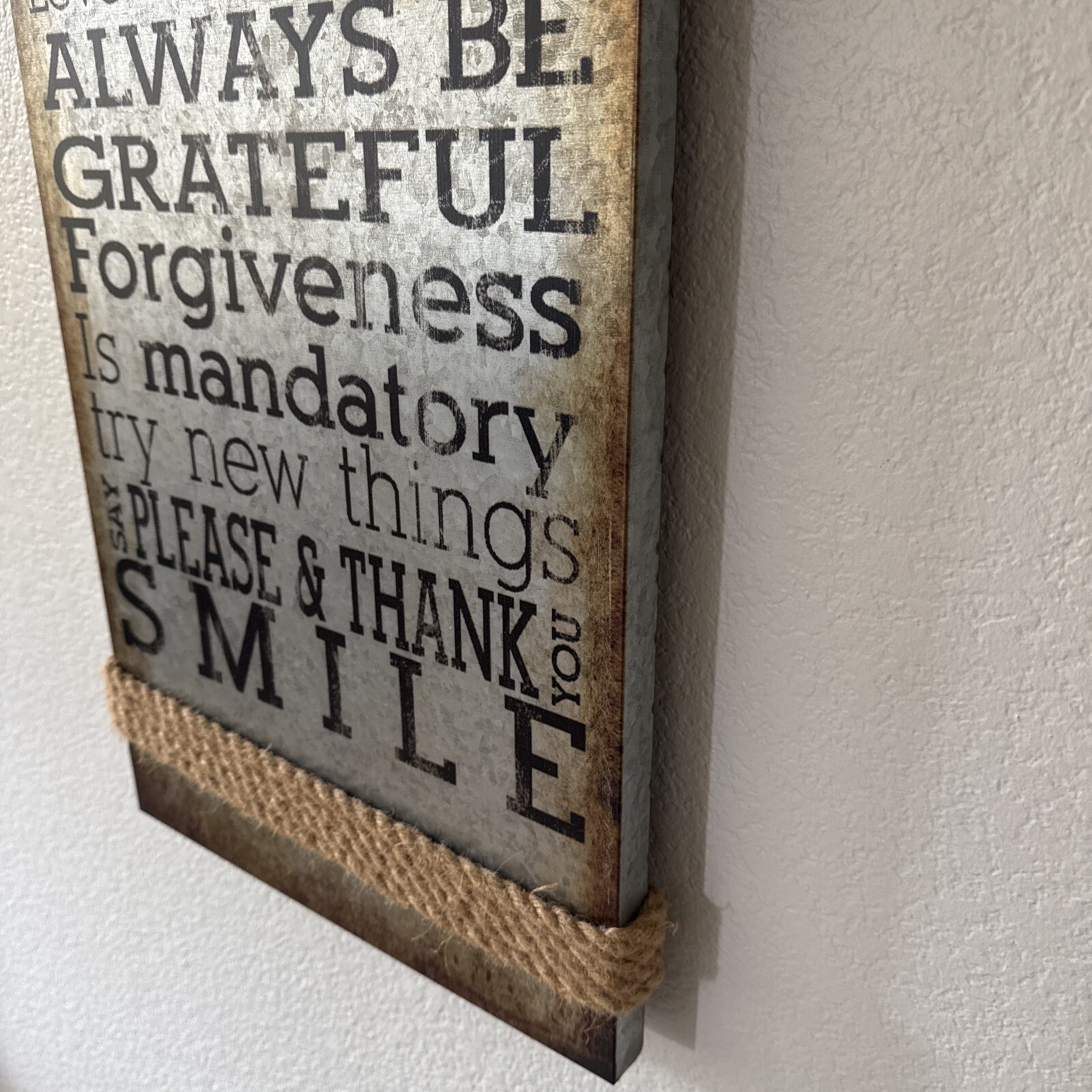 Add a touch of rustic charm to your home decor with this large farmhouse style wall sign. The sign is made of mixed materials including stainless steel and has a silver finish. It features a family-oriented theme and is designed to be a decorative piece that will add character to any room. The sign measures 37.5 inches in height and 14 inches in width, making it suitable for teens, adults, and kids. It is easy to care for and does not require any additional parts to be displayed. Bring the warmth of the countryside into your home with this beautifully crafted wall sign. ALWAYS tell the truth Use kind words KEEP YOUR PROMISES GIGGLE & LAUGH STAY HAPPY& Be Positive Love One Another ALWAYS BE GRATEFUL, Forgiveness Is mandatory try new things PLEASE & THANK YOU, SMILE