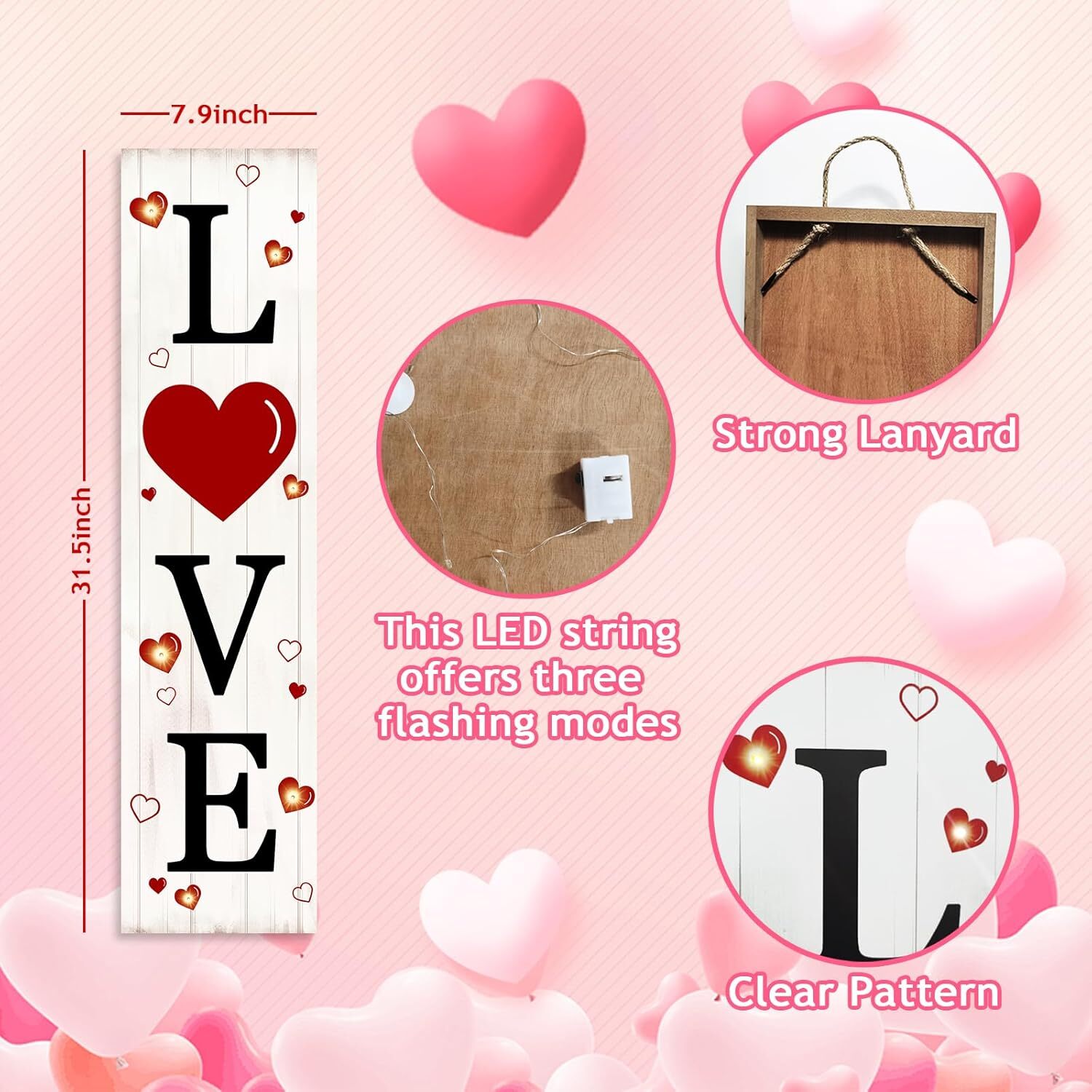 Charming Vintage Design: Elevate your Valentine's décor with this white vintage-style porch sign , featuring a classic red heart pattern that captures the timeless charm of the holiday. Glow-in-the-Dark Feature: Embedded LED lights illuminate the sign at night , creating a warm and inviting glow that enhances the festive spirit. Ideal Display Size: Once assembled, the sign measures 7.8 inches wide and 31.5 inches tall , with a sturdy back rope for easy hanging or the option to lean it against a surface. Effortless Assembly & Storage: Designed for easy setup, this porch sign comes in two equal-length wooden boards , with clear instructions and included accessories for quick assembly and disassembly. Versatile Placement: Perfect for front doors, porches, walls, or entryways , its bold red color and Valentine’s-themed design make it a standout decoration for any space. Durable & Reusable: Crafted from high-quality materials , this sign is built to last, ensuring you can enjoy its charming festive appeal year after year.