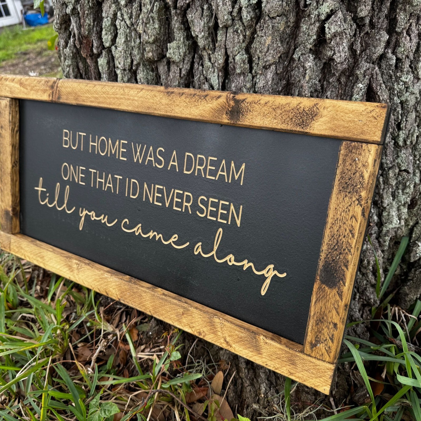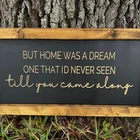 This listing is for "But home was a dream one that I'd never seen till you came alone”, wood farmhouse sign. The frame is made of 1x2 pieces of wood and is stained. The sign consists of thick, black MDF that is painted with chalk paint prior to being carved on a CNC machine. All signs are engraved/carved. No stickers or painted letters! Farmhouse signs are 12 inches tall and 24 in wide. Details: **Signs come with (2) hooks on the back side for easy hanging. **Weight of the farmhouse sign is approximately 3.5 lbs. **All items are sealed with multiple top coats to prevent any wear.