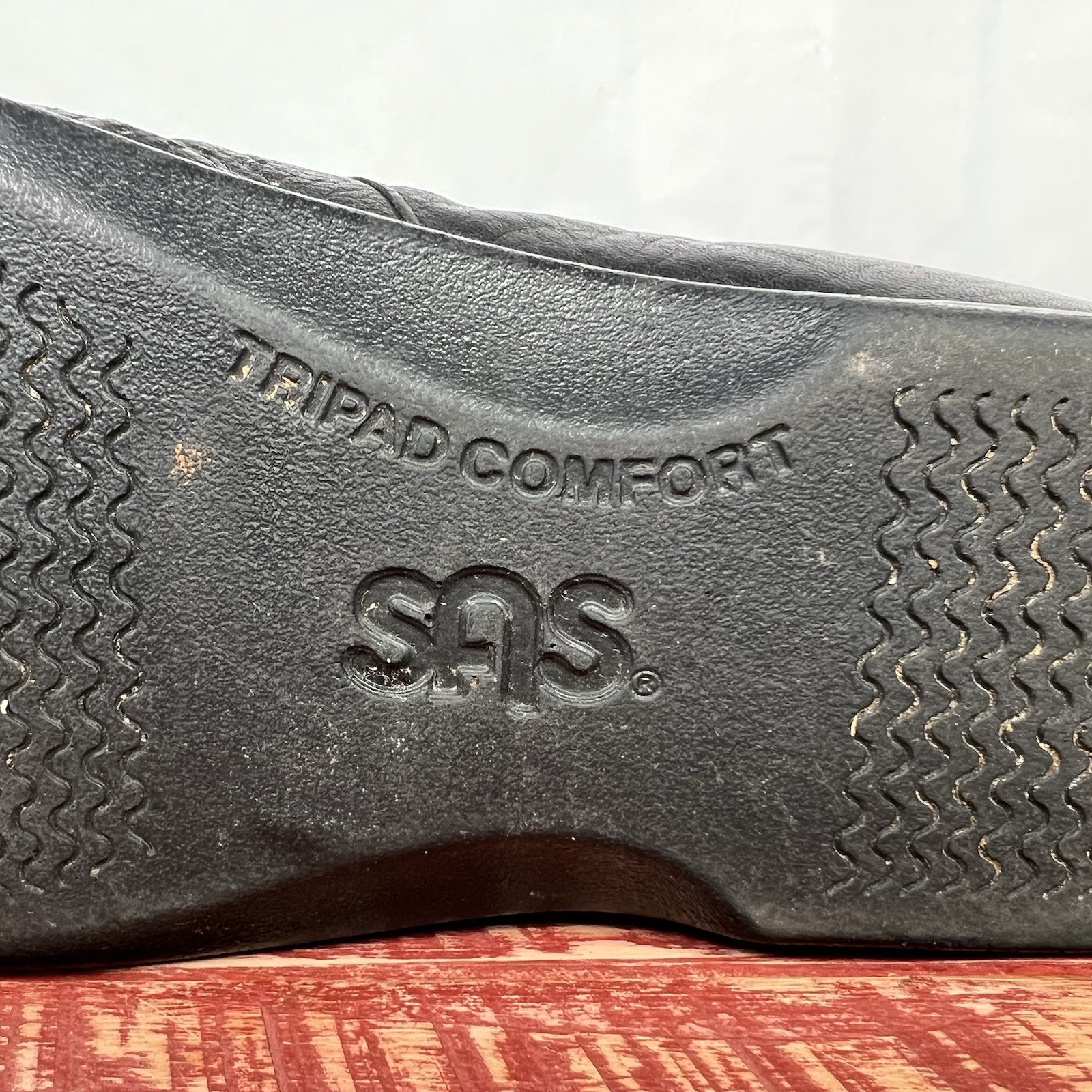 SAS women’s black leather slip-on loafers in size 9 Medium. Features SAS Tripad® Comfort design with a cushioned, supportive feel and flexible sole. Clean and well cared for with light creasing from normal use. Great everyday comfort shoes for work or casual wear. Please review photos for exact condition. Ships promptly and securely.