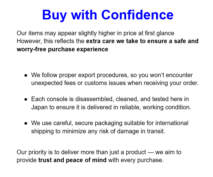 ☆ Refurbished products ☆ SONY PS Vita PCH-2000 Console w/Charger Region Free -select- Color / Memory Description Condition Very good - Refurbished Standard used condition with some signs of use such as small scratches or scuffs. Fully functional. The PS Vita is over a decade old, so we’ve replaced the analog sticks and battery with brand-new parts in every unit to make sure you can enjoy it for years to come. A USB charging cable is also included. No PSN lock . No account restrictions. The system is fully reset and ready for a new owner. Please choose your preferred set and make your purchase Console color 8, 16, 32 or 64GB Memory card For all items, we perform the following operation checks before shipping: Charging function, power on, LCD screen condition (scratches or cracks), all buttons, stick operation, volume, cartridge reading, and several minutes of gameplay. ★PLEASE NOTE★ Important Notice About the Battery The PS Vita battery is very sensitive. If it is left for a long period of time with a low battery level, even a brand-new battery can be seriously damaged. When the battery level becomes low, please be sure to recharge it before storing the system. When the item arrives, the battery is brand new but the charge level is intentionally kept low. This is a necessary safety measure for air transportation. Therefore, please charge the system first after receiving the item. Power Supply Warning Japanese consoles are made for 100V . If your country uses a different voltage, please use a step-down transformer. Country of origin Many authentic units manufactured after around 2000 are made in China. This does not affect authenticity or quality — they are official products made by the brand. Why Buy From Our Store? All of our items go through a thorough inspection right before shipping. Here’s why you can shop with confidence: ・Careful check of cosmetic and physical condition ・Power-on and output functionality test ・Verification of all buttons (Power, Eject, etc.) ・Disc reading test (including trays and lenses) ・Actual gameplay test ・The delivery to you is very fast Unlike “sold as-is” items, all of ours are thoroughly checked, so you can shop with peace of mind. Whether it’s your first time or you’re a repeat customer, just relax and enjoy shopping with us. *If you have any questions to ask, feel free to contact us anytime. Shipping Expedited Shipping : FedEx or DHL We ship orders as quickly as possible—usually the same day depending on the timing of your order, and no later than the next business day. Estimated delivery time after shipment United States: 1–4 business days Outside the United States: 3–7 business days ・We always send the item with a tracking number. So please place an order without any concern on delivery. You can always track the delivery status. ・Shipping is only available to the address registered in eBay. If you want us to send another address, please change your address on eBay and then place an order. ・Shipping is available from Monday to Friday. Weekends are not available because freight (shipping) companies are closed. ・We do not mark merchandise values below value or mark items as “gifts” – Japan, US and International government regulations prohibit such behavior. About Importer's Obligation For U.S. customers: This item ships via DDP (Delivered Duty Paid). Import duties and taxes are already covered in the item price, so no extra payment will be required upon delivery. Please note that since I am paying the taxes on your behalf, if the item is returned, the amount of taxes I have already paid will be deducted from your refund. For international customers (outside the U.S.): Import duties, taxes, and charges are not included in the item price or shipping. These fees are determined by your country’s customs and are the buyer’s responsibility. Thank you for your understanding.
