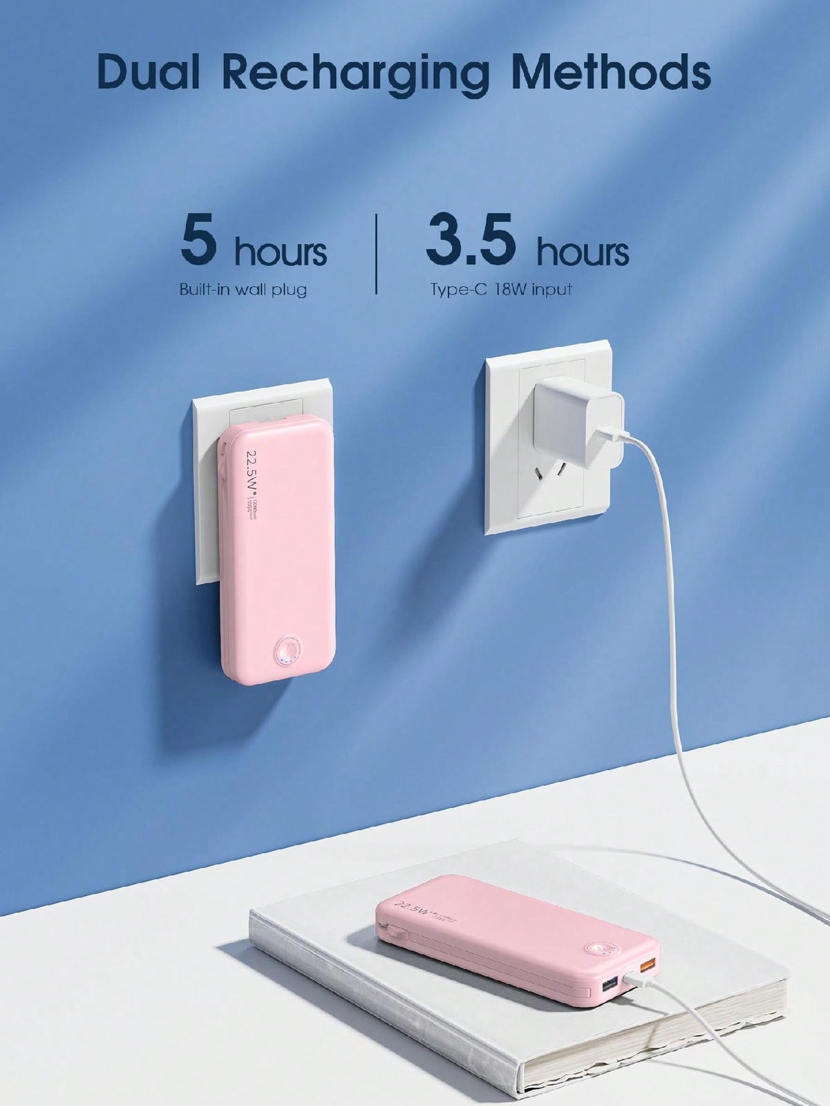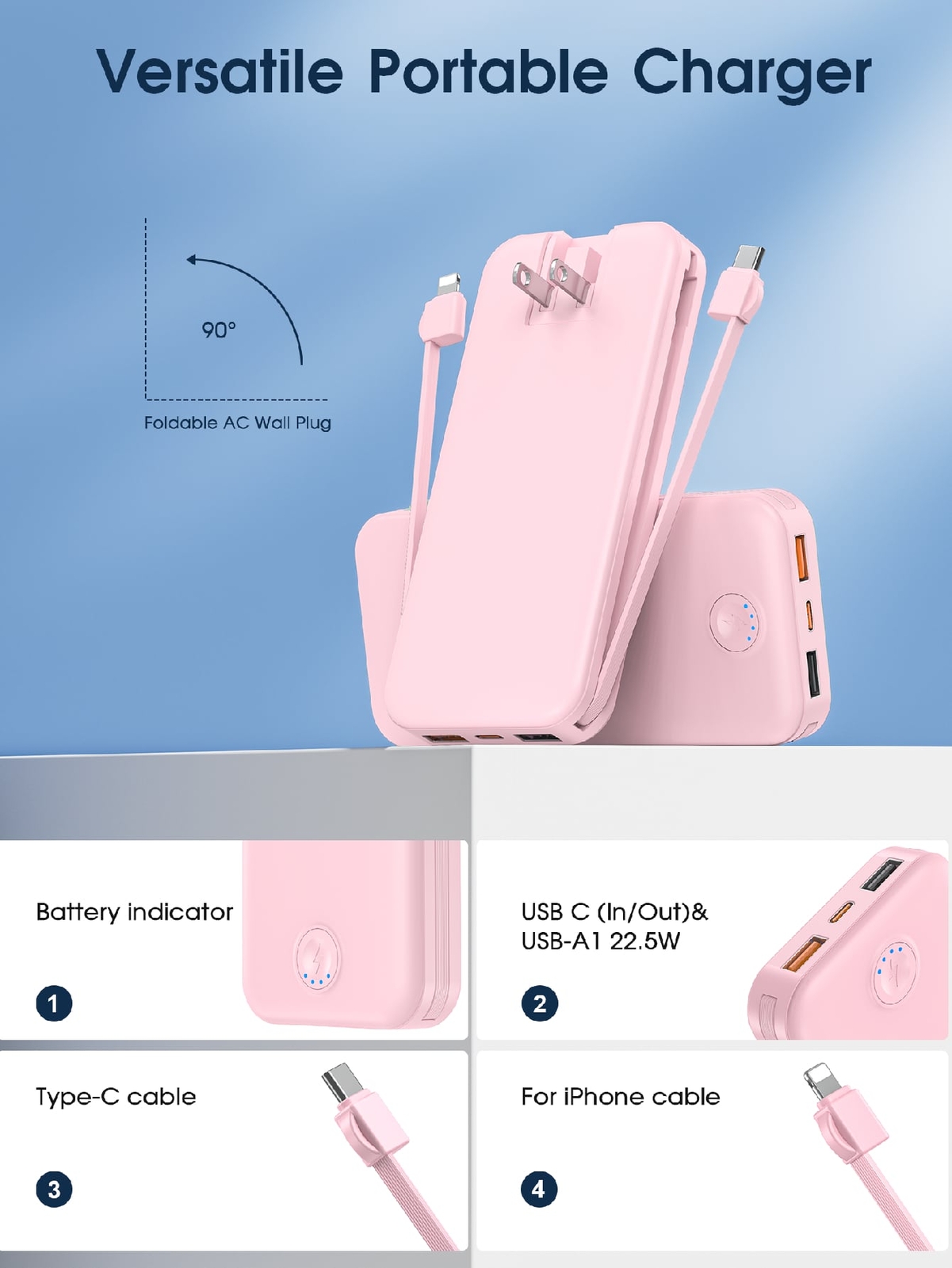 Portable Power Bank Comprehensive: This charging bank built-in USB C and for iPhone cables, top up your iPhone Android cell phones easily. The AC Wall plug allows you to recharge the portable charger directly from 100-240V wall socket, no need extra adapter, cords wherever you go. Powerful and Compact: The 12000mAh large capacity can provide 2.2 charges for iPhone 11 Pro Max, 1.6 charges for Pixel 7 Pro, 1 charge for 12.9" Tablet Pro. Battery pack dimension is 5.90 x 2.66 x 0.78 in, lightweight 0.50 Lb, convenient to take with and would not be a burden for you. Super Fast Charging: External charger has two USB-A and 1 USB C ports, capable charge 5 devices sync. The USB-A1 give 22.5W high speed delivering, charge for iPhone 12 from 0% to 75% in 30 minutes, USB C refill Pixel 6 Pro to 55% within 45 minutes by the 20W power. Steady Recharge: Need 5 hours to charge through wall and just need 3.5 hours by the 20W above fast charge cord, all-around intelligent chip protect the battery bank from short circuit, over charging, regardless of which way you choose, you can keep the power pack full of energy all the daily life. Packing List: 1x 12000mAh portable charger, 1x Type-C charge cord, 1x user manual,