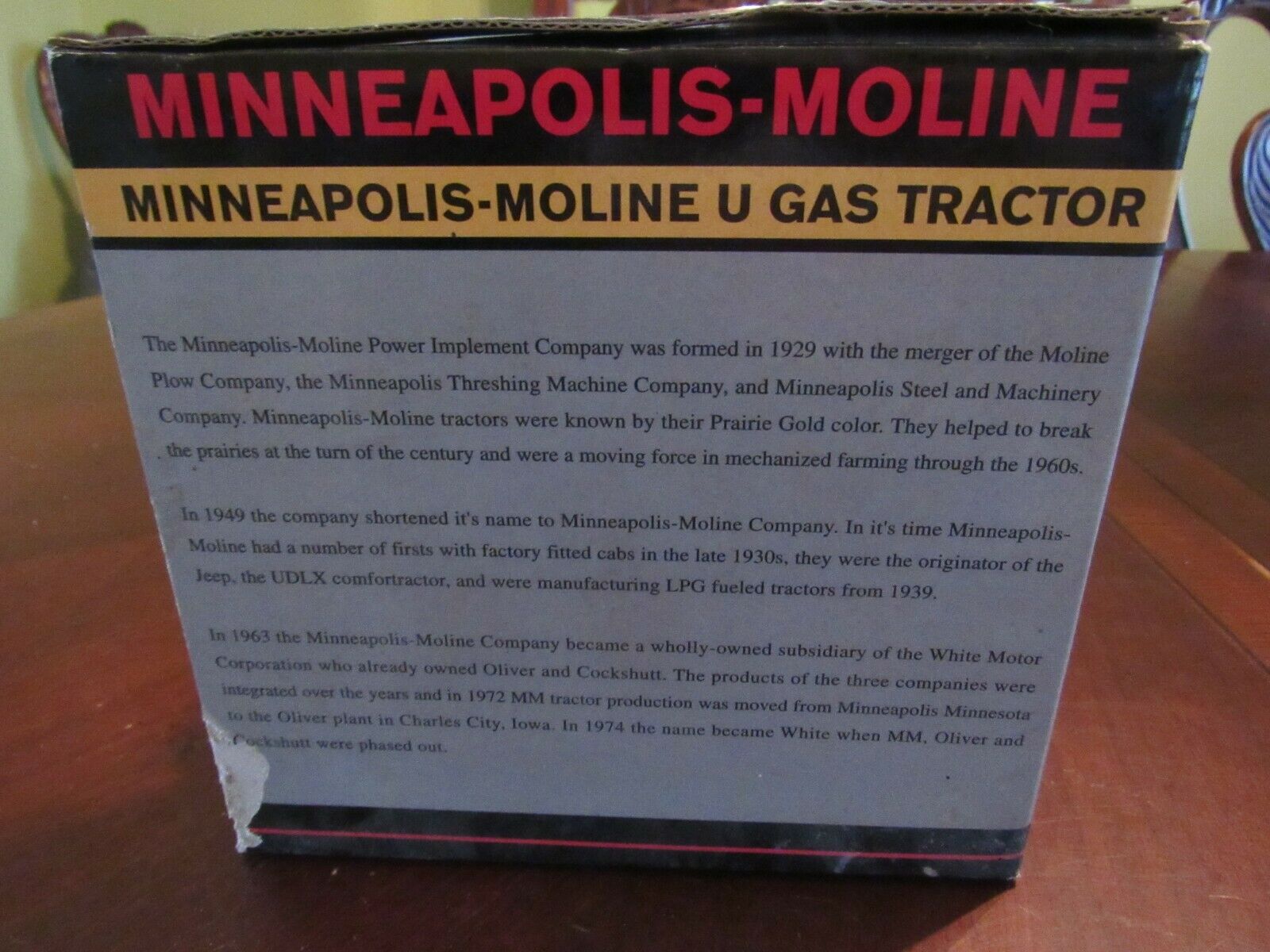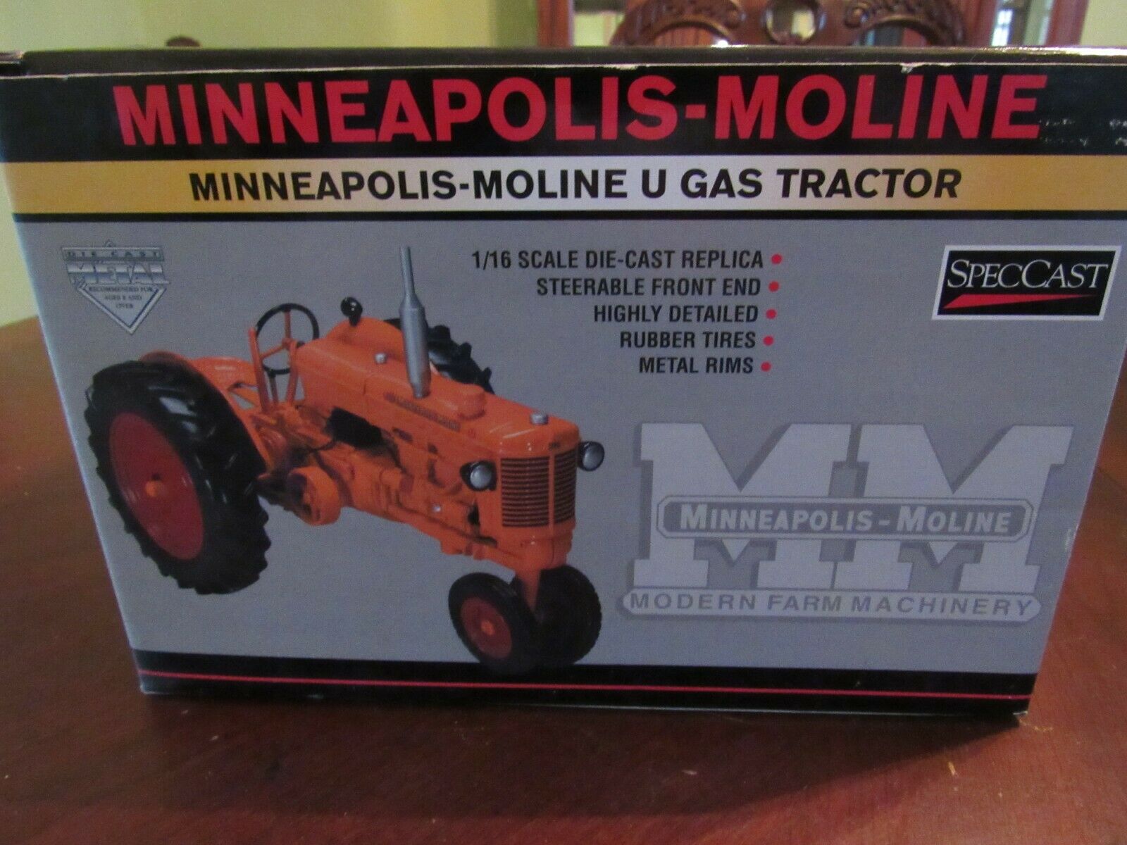 SPECCAST 1/16 SCALE MINNEAPOLIS-MOLINE U GAS TRACTOR - NIB - NEVER DISPLAYED - SCT 219 !! !! QUALITY COLLECTIBLE TOYS AT REASONABLE PRICES - COMPARE BEFORE YOU BUY!!! HIGHLY COLLECTIBLE 1/16 SCALE, DIE CAST MINNEAPOLIS-MOLINE U GAS TRACTOR. HIGHLY DETAILED, STEERABLE FRONT END, RUBBER TIRES, METAL RIMS. NEW IN THE ORIGINAL BOX - NEVER DISPLAYED - FACTORY PLASTIC STILL ON TIRES. BOX IN VERY GOOD CONDITION WITH ONE END BLEMISH (SEE PICS). ONE YOU'LL BE PROUD TO OWN!!! BUY WITH CONFIDENCE - CHECK OUT MY 100% POSITIVE FEEDBACK. 14 DAY MONEY BACK GUARANTEE. NOTE: I SHIP IN 3 BUSINESS DAYS.