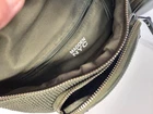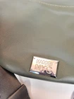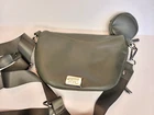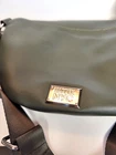 Steve Madden NYC loden green crossbody purse bag. Adjustable strap. Faux leather with mesh look from and blingy outer zippered pocket with crystals. Detachable zippered pouch would be great from earbuds. Bag has zippered closure and inside one zippered pocket. Only flaw is nick in front pocket zipper pull (see picture). Not very noticable. Heavy silver hardware. 9 1/2" wide, 6 1/2" high and 2-3" deep (narrow at bottom and widens at top. Trapezoid shaped.