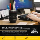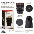 STRATA CUPS Camera Lens Coffee Mug -13.5oz | (2 LIDS + SPOON + BAG) Gifts for Him, Dad Gifts, Photography, Camera accessories, Novelty Gifts, Gifts for Him Product Details Brand: STRATA CUPS Color: Black Special Feature: Sliding Lid, Lightweight, Food Grade Steel Interior, Vacuum Insulated, Double Wall Style: Retro Theme: Photography, Office, Gift, Travel, Quirky, Costume, Hobby, Funny, Camera, Coffee Brand: STRATA CUPS Color: Black Special Feature: Sliding Lid, Lightweight, Food Grade Steel Interior, Vacuum Insulated, Double Wall Style: Retro Theme: Photography, Office, Gift, Travel, Quirky, Costume, Hobby, Funny, Camera, Coffee Recommended Uses For Product: Gift for Photography Enthusiast, Tea Mug, Travel Thermos, Gift for Woman, Gift for Coffee Lover, Tea Drinker, Present for Friend, Coffee Cup, Gift for Man, Uncommon Gifts, Gift for Filmmaker Included Components: Slider Lid, "Lens protector" carrying bag, Travel Screw-on Lid, Tea Spoon, Coffee Mug Specific Uses For Product: Fun Gift, Camera Accessory, Travel Cup, Cold Drinks, Hot Drinks Shape: Round Pattern: Solid Product Care Instructions: Hand Wash Recommended for Cup; Lids & Spoon are Dishwasher Safe Age Range (Description): Adult Material Feature: Insulated Reusability: Reusable Unit Count: 1 Count Product Dimensions: 3.7"W x 7.3"H Material Type Free: BPA Free Number of Items: 1 Team Name: Camera Lens Coffee Mug League: Coffee Lens Camera Mug Package Type: Standard Packaging Manufacturer: STRATA CUPS UPC: 608802235653 643710993516 Size: 4 Piece Set Item Weight: 9.9 ounces Is Discontinued By Manufacturer: No Date First Available: December 28, 2016 SUPER BUNDLE! NO SPILL LID + RETRACTABLE LID + SPOON + BAG!: When you're rushing around with the morning brew the last thing you want is the lid popping off! Your Strata Cups Camera Lens Coffee Mug has SCREW ON lids that won't budge. The fully closed lid is non-spill! Even if you throw your coffee across the room your coffee cup lid will keep your brew safe, until you come to your senses and drink it while it's hot. 13.5oz STAINLESS STEEL LINING = HOT DRINKS STAY HOT FOR LONGER: Insulated stainless steel interior transforms your unique coffee mugs photography gifts into a convenient coffee thermos! Food grade ABS plastic keeps your hands cool from hot liquids. Fits 13.5floz liquid (without lid) and 11oz when lid securely attached. From the kitchen to the car to the office - your coffee is safe from harsh glare of an early start. LOVERS OF PHOTOGRAPHY and novelty mugs will get a kick out with self stirring camera lens mug the exact replica of a Model EF 24-105mm Camera. Its the fun coffee thermos that doubles as a guaranteed conversation starter. Your coffee mug comes with two lids The Retractable Sipper Lid, and Camera Lens replica closed lid + stainless steel spoon. NOT A COFFEE DRINKER? NO PROBLEM - IT'S MULTIPURPOSE: If you're not one of those folks who loves wrapping both hands around a hot cup o' joe, you can still enjoy this fun coffee mug! Fill it up with cold drinks or smoothies, they'll stay nice and cool under the sealed lid. Or, use it as a nifty pen holder, hold loose change - or a vase. We're not going to tell YOU how to enjoy your cup, you choose! THE STRATA CUPS PROMISE: We'll never deny you a great cup of coffee, or tea! We are 100% confident you will be delighted by the quality and fun of your Camera Lens Mug. But, if for any reason you're not completely satisfied please don't hesitate to reach out!