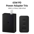 Samsung T6530 65W PD 3.0 Trio Power Adapter Super Fast Charging Wall Charger - Black (Bulk Packing) ? Designed for devices with USB Type-C charging capabilities; up to 65W output; Power Delivery support; reversible USB Type-C connector ? Charge your Galaxy S24, S24 Plus, S24 Ultra, S23, S23 Plus, S23 Ultra, S20, S21, S22, Tab S6, Tab S7, Tab S8, Note20, Flip Z3, Z4 and Fold Z3, Z4 smartphone and other select devices with this black Samsung USB-C fast-charging wall charger. The AC adapter provides up to 3 amps for fast, stable charging, while the 65W super fast charge capability uses Power Delivery for efficient charging. - Wide-ranging use Designed for devices with USB Type-C charging capabilities. - Power Delivery support Up to 65W output with USB 3.0 PD compatible devices. - Reversible USB Type-C connector (USB-C cable not including) Lets you connect your cable to your device in either direction. Charge USB-Powered Devices - PD Fast Charging - Up to 65W- Single Charging Port - Super Fast Charging 2.0 max. 45W, PD 3.0 PPS max. 65W - Includes EP-T6530 Charger Adapter Only Power: Input Voltage 100-240 V Output Voltage (Max, Normal Charge) 5 V Output Voltage (Max, Fast Charge) PDO : (USB-C1, PDO) 9 V, 15 V, 20 V / (USB-C1, PPS) 5.0-20.0 V / (USB-C2, PDO) 9 V / (USB-C2, PPS) 5.0-11.0 V / (USB-A) 9 V Output Current (Max, Normal Charge) 3 A Output Current (Max, Fast Charge) PDO : (USB-C1, PDO) 3 A(9 V), 3 A(15 V), 3.25 A(20 V) / (USB-C1, PPS) 3.5 A(5.0-11.0 V), 2.8 A(5.0-16.0 V), 2.25 A(5.0-20.0 V) / (USB-C2, PDO) 2.77 A(9 V) / (USB-C2, PPS) 3.0 A(5.0-5.9 V), 2.25 A(5.0-11.0 V) / (USB-A) 1.67 A(9 V) Quickly recharge your USB Type-C devices with this black 65W USB Type-C Fast Charge Wall Charger from Samsung. This single-port charger uses Power Delivery (PD) to provide the most efficient charge possible to your connected device. Any PD device can charge at up to 65W, while other USB Type-C devices rates will vary. The Fast charger delivers up to 3A to give your phone power at a faster rate than standard 1A chargers. This charger comes with a detachable USB Type-C cable, so you can charge your phone from any other USB Type-C power source such as your computer or a portable battery. Compatibility List: ?Samsung Galaxy S24 5G, S24 Plus 5G, S24 Ultra 5G, S23 5G, S23 Plus 5G, S23 Ultra 5G, S22 Ultra 5G, S22 Plus 5G, S22 5G, S21 Ultra 5G, S21 Plus 5G, S21 FE, S21 5G, S20 Ultra 5G, S20 Plus 5G, S20 5G, S20 FE ?Samsung Galaxy S10, S10 Plus, S10e, S9, S9 Plus, S9 Active, S8, S8+, S8 Active ?Samsung Galaxy Note 20 Ultra 5G, Note 20 5G, Note 10 Plus 5G, Note 10, Note 9, Note 8 ?Samsung Galaxy A02s, A03s, A03, A3, A5, A6, A7, A8, A9, A10, A10E, A11, A12 ?Samsung Galaxy A20, A21, A21s, A22, A31, A32, A40, A41, A42, A50, A51, A52, A53, A60, A70, A70s, A71 5G, A72, A80, A90 ?Samsung Galaxy Z Fold 2/ Z Fold 3/ Z Fold 4/ Z Flip/ Z Flip 3/ Z Flip 4/ F52 ? Samsung Galaxy Tab A 8.0(2018), Tab A 10.1 (2019), Tab 10.5, Tab A 8.0 ? Google Pixel, Pixel 2, Pixel 3, Pixel XL, Pixel 2XL, Pixel 3XL, Pixel 4XL, Pixel 3A ? LG G5, G6, G7, G7 Thing, G8, Stylo 4, V20, V30 ThinQ Plus, V35, V30S, V40 ThinQ Plus ? Motorola Moto Z, 11, One Plus, HTC, ZTE Axon, Nexus 6p 2018 and up iPad Pro 12.9 ?Other USB Type C Device Payment Delivery details Terms of sales Contact us We accept PayPal , Google pay , Visa , Amex , Discover Payment. Items Included Wall Charger Only Voltage 5V - 20V Item Height 52 mm Design/Finish Matte, Plain Material Rigid Plastic Cable Length NO Cable Item Length 71 mm Country/Region of Manufacture Vietnam Mounting Location Wall Wireless Charging Standard USB-C x 2, USB-A Item Width 30 mm MPN EPT6530NBEGUS Compatible Brand Universal Color Black Brand Samsung Connectivity USB-C Number of Ports 3 Features Fast Charge Compatible Model Universal Type Power Adapter