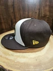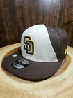 Elevate your accessory game with the San Diego Padres New Era 9Fifty Snapback Adjustable Hat. A must-have for any baseball enthusiast, this cap features a sleek brown colorway, complementing any sporty or casual attire. The hat's adjustable snapback ensures a comfortable, tailored fit for all-day wear, while the breathable mesh back keeps you cool during those intense baseball games or when out on the town. Crafted with quality materials by New Era, known for their exceptional sports headwear, this baseball cap is designed with a solid pattern that exudes a timeless streetwear vibe. Whether you're headed to the office or cheering from the stands, this cap is versatile enough for various occasions and a perfect addition to any fan's collection. Bottom corner of crown may need a slight reshape... priced accordingly