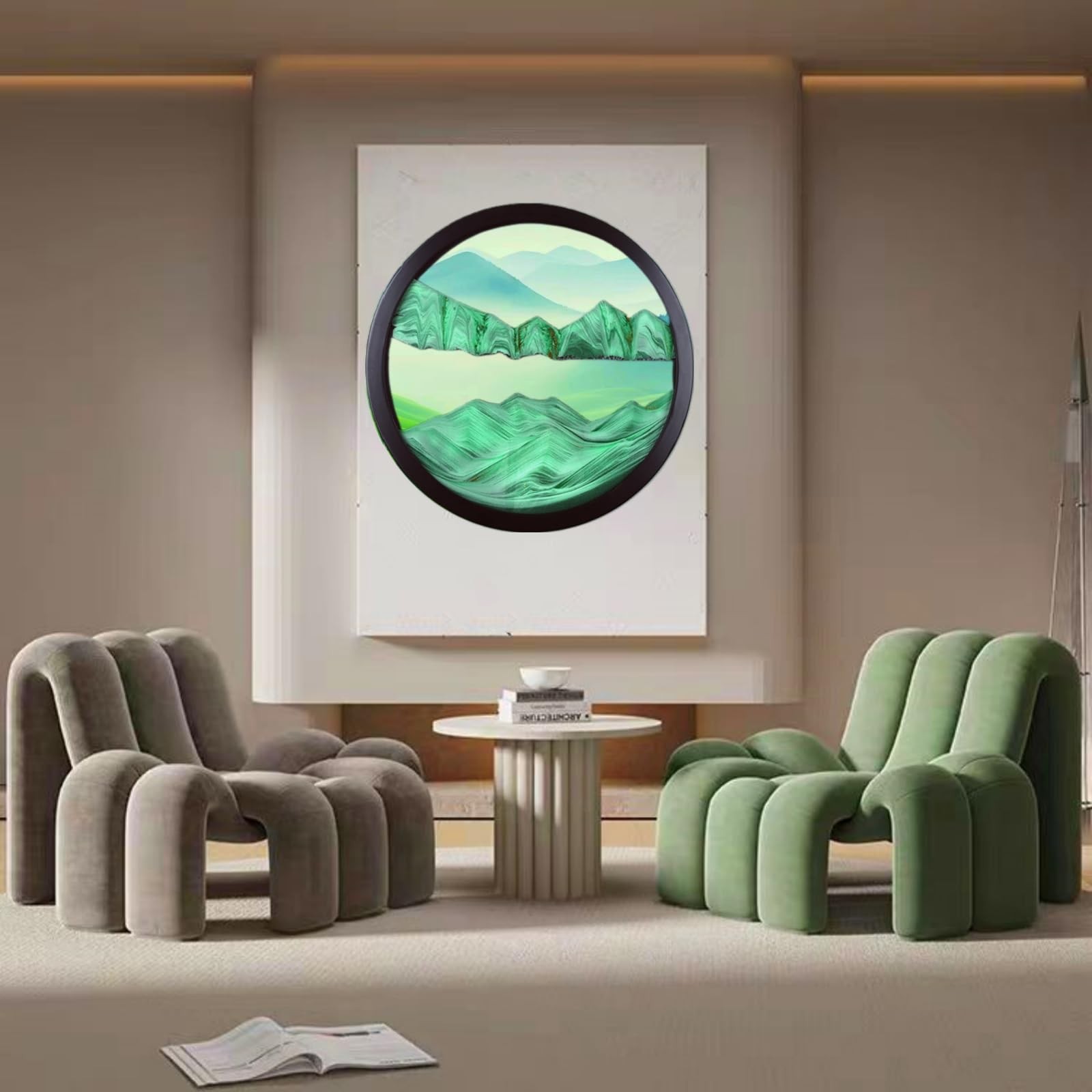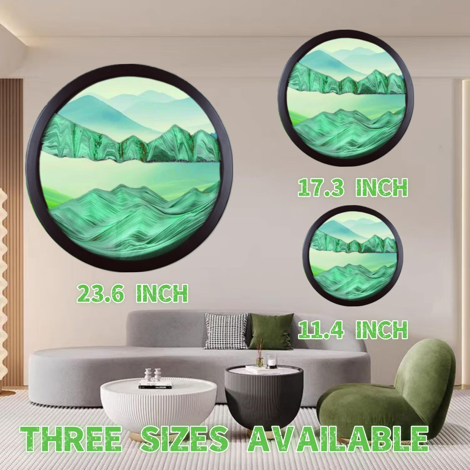 Sand Art Liquid Motion, Moving Sand Art Décor, 3D Wall Mounted 360° Rotate Sculpture, Wall Art Deep Sea Sandscape Room Decoration, Relaxing Mood Home Office Work Decor (Green, 23.6'') 【High Quailty】Lead-free high transparency tempered glass as clear as crystal, allows you to fully enjoy the beauty of quicksand. The detail is carefully screened sand, colorful, levels clearly demarcated, flow out the pattern of 3D effect is excellent. The frame is made of solid wood frame, strong and durable, fresh and simple, beautiful and generous. 【Pefect Home Decoration Ideas】 With excellent aesthetic color matching and 3D Natural Landscape Dynamic Art design, this modern wall art is easy to mix and match different home styles to create a welcoming vibe into any space, like living room, bedroom, kitchen, bathroom, dining room, office hotel, restaurant bar, or any other occasion. 【Stress Relieve Decor】Moving sand pictures create a new sand picture with each turn.The sand never makes the same design twice. Watching the colored sand slowly tumble down the circle is relaxing and calming to the mind, which can relieve stress, relax your eyes,cultivate patience, give you unexpected surprise and happiness. 【Easy To Install】 The hook is designed on the back of the product, You just need to punch holes in the wall, fix the Moving Sand Art Bracket Brace and hang the product directly, It is strong, simple, convenient, tough, fine workmanship, Not easy to rust. 【Mutiple Sizes & Creative Gift 】We offer three sizes, Small size is 11.4*11.4 inches; medium size is 17.3*17.3size; large size is 24*24 inches. Perfect size suitable for various occasions. Exquisite 3D quicksand paintings are great gifts, not only for couples, but also for boyfriend and girlfriend, anniversaries, birthdays, Mother's Day, Thanksgiving, Graduation, Valentine's Day, Christmas and other important days.