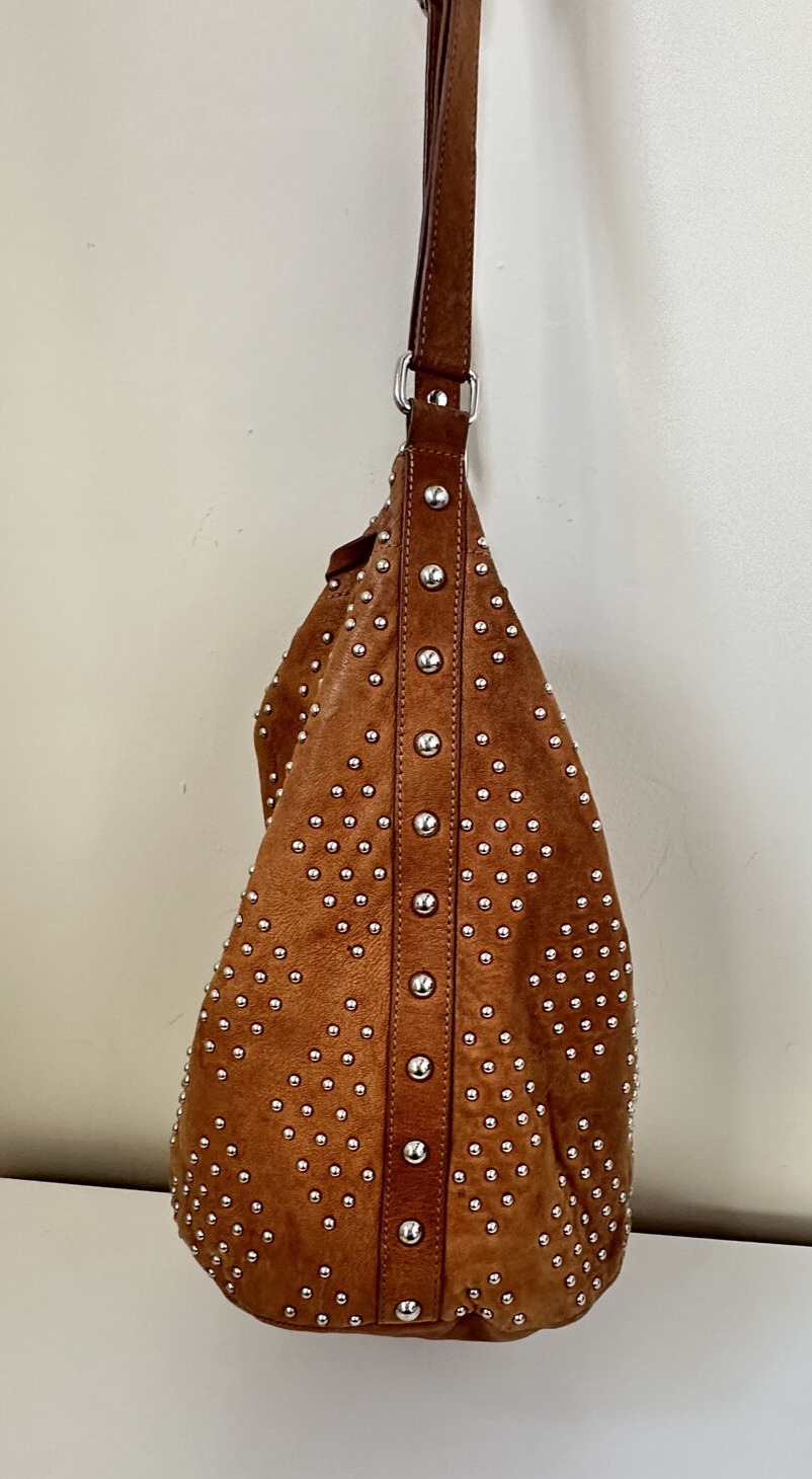 Features: Adjustable Strap, Detachable Strap, Inner Pockets, Lined, Outer Pockets, Pockets Handle Style: Shoulder Strap Occasion: Business, Casual, Party/Cocktail, Travel Hardware Color: Brown Brand: Sandro Personalize: No Exterior Color: Brown Handmade: No Lining Color: Brown UPC: N/A Bag Depth: 5 in Seller Notes: “Lightly used and in very good condition.” gtin13: N/A Bag Height: 15 in Accents: Studded Lining Material: Leather Handle/Strap Material: Camel Closure: Drawstring Size: Medium Style: Shoulder Bag Department: Women Hardware Material: Stainless Steel Accessories: Luggage Tag, Other Strap Handle/Strap Color: Brown Bag Width: 9 in Exterior Material: Camel, Leather