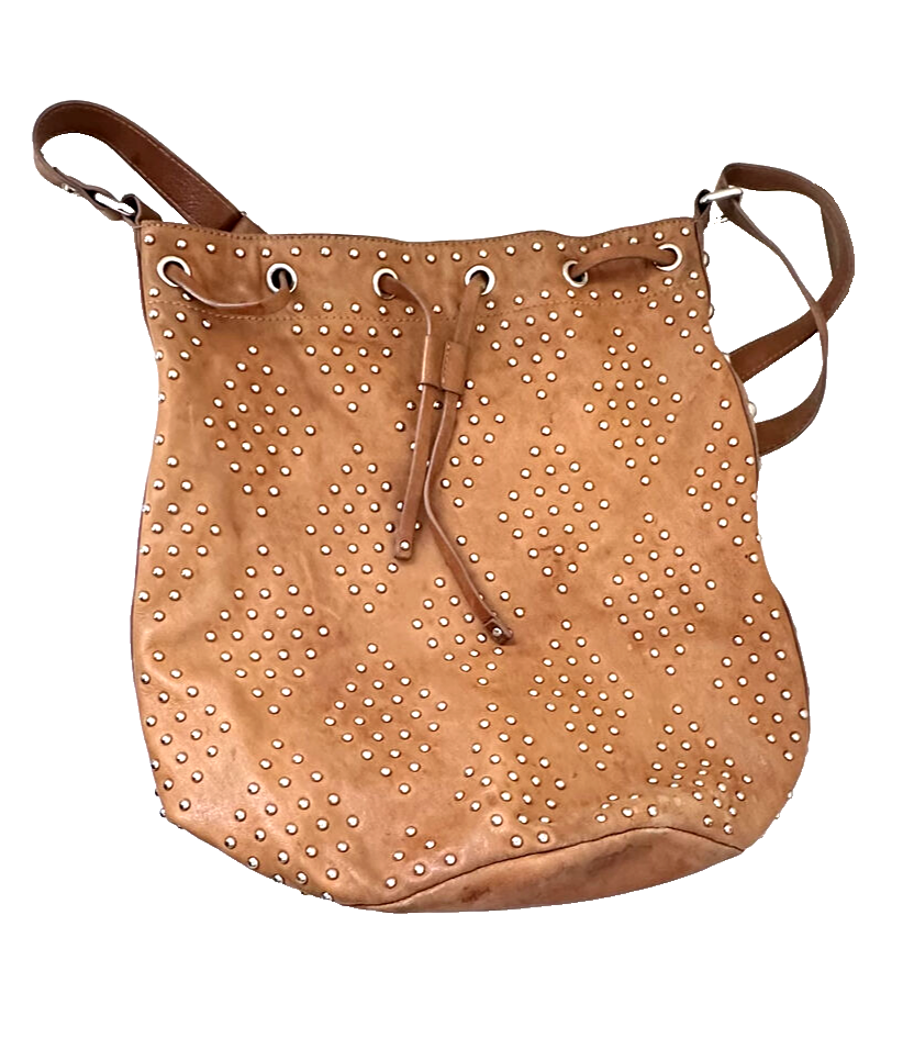 Sandro brown camel leather bucket bag with studded shoulder strap