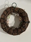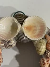 Seashell wreath ornament measuring approximately 4” in diameter. It has a variety of seashell types atop a wooden wreath base. Hook for hanging. Preowned. Very good condition