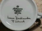 This unique coffee mug features a beautiful reindeer design by Seltmann Weiden, crafted in Bavaria, Germany. The round, petite small-sized mug stands at 3.5 inches tall and 2.75 inches wide. This is preowned and is does show wear specifically to the gold band around the cup and the colored areas. This is signed on the bottom by Laura Koshander Finland. I THINK that is what the name is, but I might be wrong. Take a look.