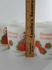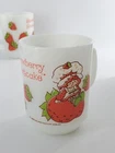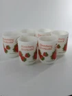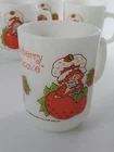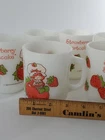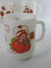 Delightful vintage find! This set of 6 Strawberry Shortcake mugs from the 1980s are so fun. These are 10 oz milk glass mugs by Anchor Hocking which feature a round shape and medium size, perfect for serving hot or cold beverages. The mugs are painted with a strawberry design, representing the popular 1980s cartoon and TV characters franchise. Made of white milk glass with a capacity of 10 oz, these mugs are a collectible piece for fans of Strawberry Shortcake and collectors of vintage kitchen decor. The mugs are decorated with handles and are suitable for hand wash only to maintain their original condition. These mugs are in fantastic condition with no chips or cracks and only minor paint loss on a few of the mugs. See pictures.