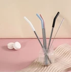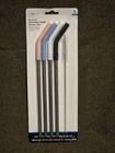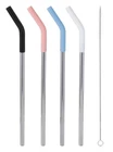 The product is a set of four reusable metal straws made of stainless steel, accompanied by a cleaning brush. Each metal straw is 10.5 inches in height and features a solid color design - pastel pink, pastel blue, white, and black. It is intended for use by boys, girls, and adults for beverages, with a drink. The straws come with a straw cleaning brush and should be hand washed. The brand is Mainstays and the straws are made in China.