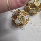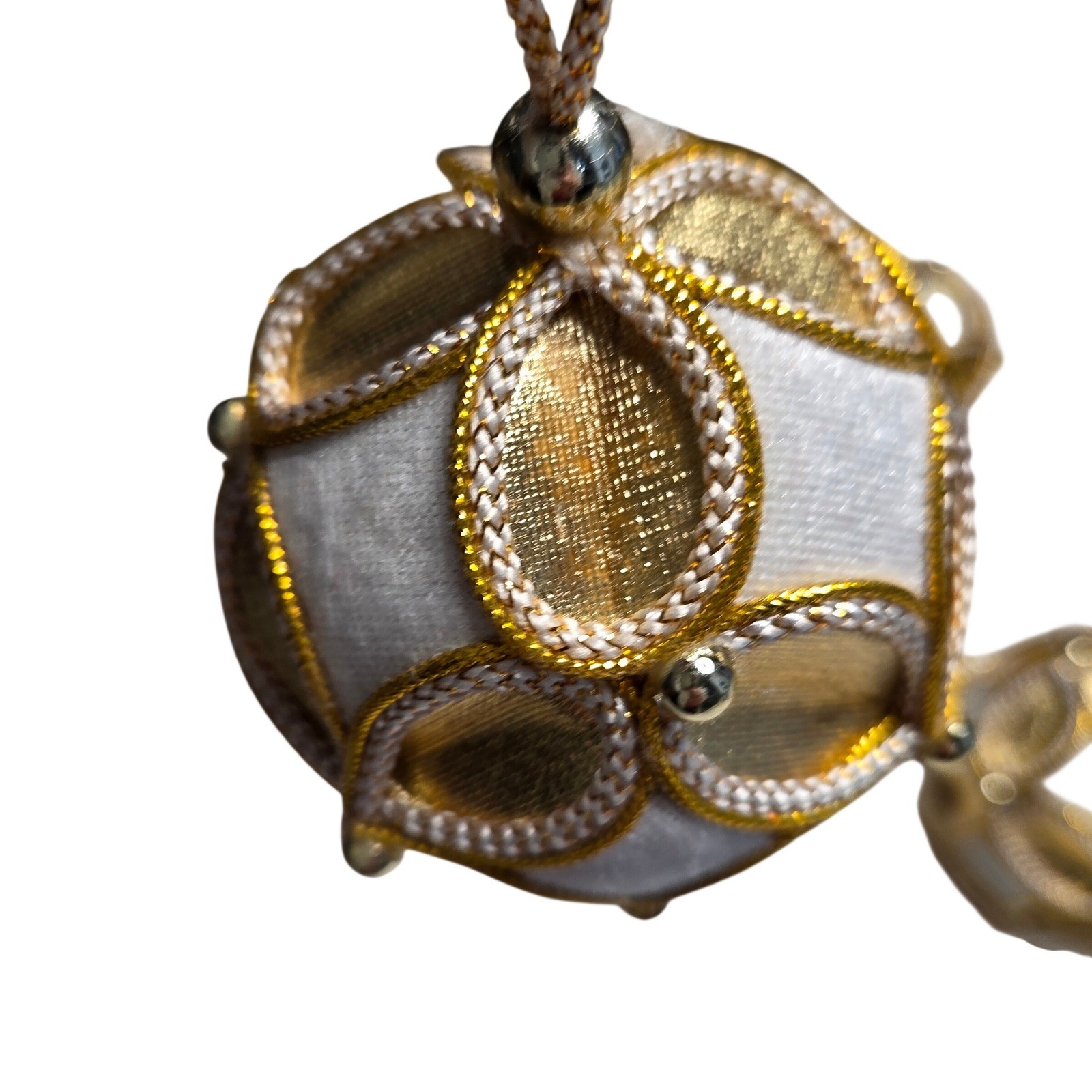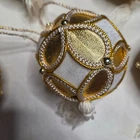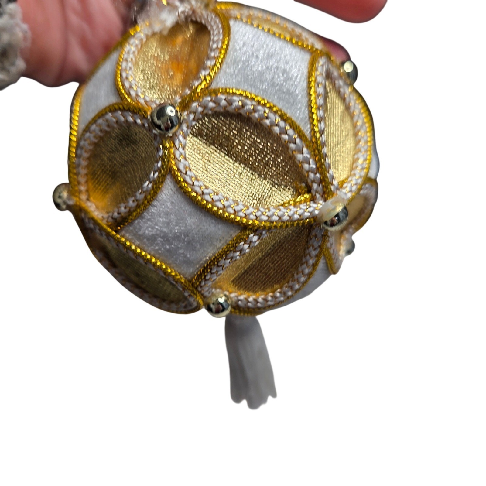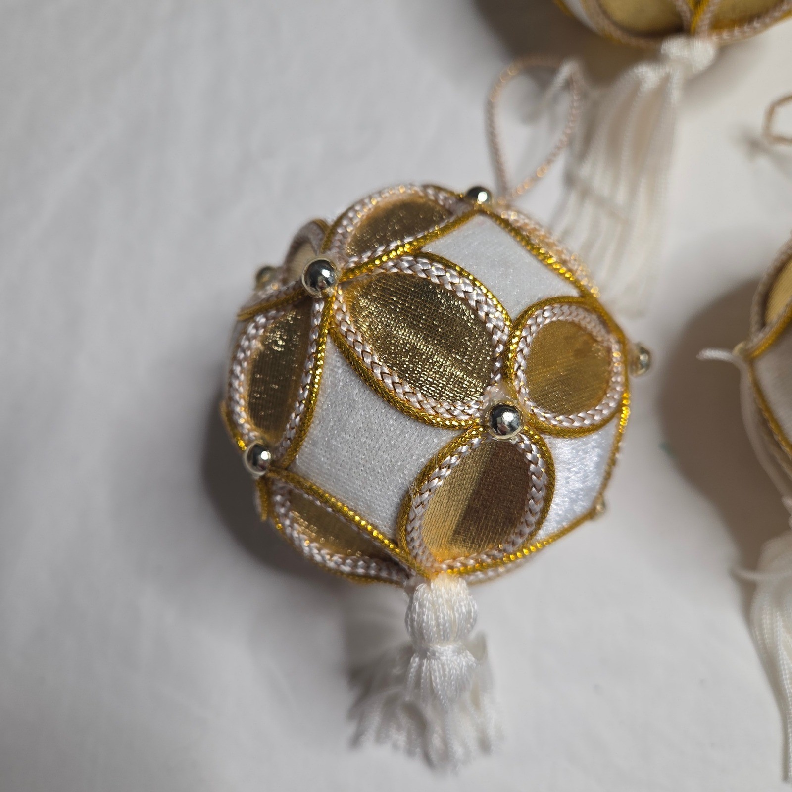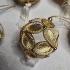 Adorn your holiday tree with this enchanting set of seven Christmas ornaments. Each spherical bauble showcases a luxurious white velvet base intricately overlaid with a shimmering gold filigree pattern, creating a stunning visual contrast. Delicate gold piping and small metallic beads accentuate the elegant design, while a soft white tassel dangles gracefully from the bottom, adding a touch of festive charm. A simple loop at the top makes for effortless hanging. These exquisite ornaments are perfect for adding a touch of opulence and sophistication to your Christmas tree, or as a delightful gift for loved ones during the holiday season. Type: Bauble Material: Cloth, Polyester, Metal Shape: Circle Features: Hanging, Embellished, Beaded Number of Items: 8 Set Includes: Tree, Finial, Bauble Theme: Holiday Department: Adults Pattern: Geometric Item Height: Less Than 5 in Unit Type: Unit Keywords: Christmas ornaments, holiday decor, tree decorations, gold accents, tassel ornaments, festive, elegant, velvet ornaments, ornament set, holiday gifts, winter decor, shimmering, luxury