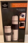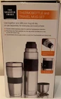 This set includes a Sharper Image thermobottle and travel mug in silver stainless steel. Suitable for both hot and cold beverages, it is ideal for on-the-go use and maintaining drink temperatures.