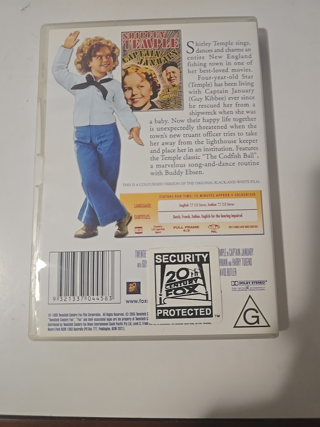 "Captain January" is a heartwarming DVD featuring the talented Shirley Temple in this 1936 classic film. Directed by David Butler, this children and family genre movie has a G rating and a run time of 72 minutes. The DVD is in PAL format with an aspect ratio of 4:3, making it perfect for fans of old-school cinema to enjoy the delightful story of Captain January and her adventures. With a star-studded cast including Jane Darwell, John Carradine, and Buddy Ebsen, this DVD is a must-have for any Shirley Temple enthusiast or collector.