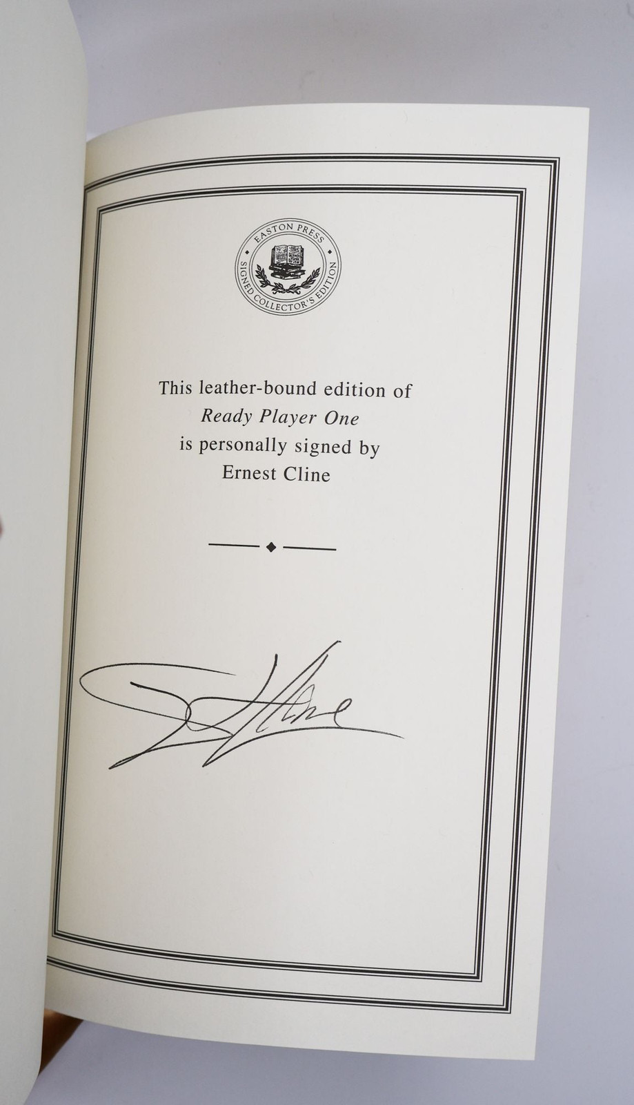 READY PLAYER ONE [Signed] Author: Cline, Ernest Title: READY PLAYER ONE [Signed] Publication: Norwalk, CT: Easton Press, 2016 Edition: Signed Collector's Edition Description: Octavo, 374 pages. In Very Good condition. Bound in full dark blue fine genuine leather, gilt lettering and decoration to paneled spine and front cover; gilt text block; silk endpapers; silk ribbon bookmark. Mild general shelf wear to boards, including light scratching to text block. Signed flat on limitation page by Ernest Cline. Shelved in Case 8 1/4. Seller ID: 1391755 Subject: Dupont Circle, Fine Bindings & Private Press, Literature Welcome to the eBay store of Second Story Books! DC's Oldest Rare and Used Bookstore, Second Story Books operates two open shops in the Washington D.C. metropolitan area. We have an extensive internet presence and provide accredited appraisals member ASA. This listing was created by Bibliopolis.