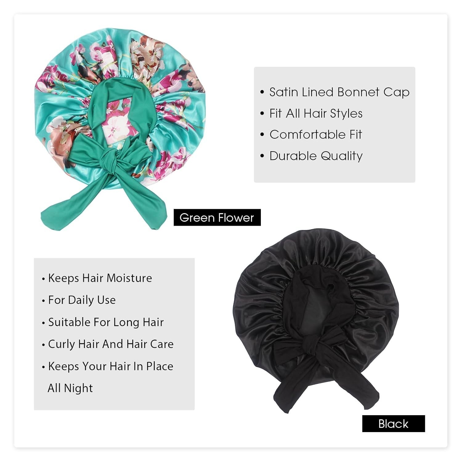 【Satin Bonnet with Stretchy Tie Band】- This silk satin hat has a soft elastic long strap, you can make tie and make bonnet firmly on head, it protects your hair well. He makes you feel comfortable. Sleeps all night and doesn't slide off your head while sleeping. Not too tight and breathable. Washable and no fade. 【Comfortable Fit】- Our shower and bath caps are designed with a concealed adjustable flexiband to ensure they are comfortable for all head sizes. They also feature an adjustable bow for added comfort and an enhanced fit, making them perfect for all hair lengths and types. You can also make a nice bow on the forehead or side using the soft wide band to make you unique and beautiful. 【Premium Fabric】- Our reusable shower caps are made from an innovative premium performance fabric which is latex-free, breathable, durable and made to last. The soft silky material adheres to the skin and has a soft texture, ideal for everyday use. 【Stylish and wide Use】- The elastic silk head scarf will keep your beautiful appearance at work, sports, parties and outdoor dinners. Suitable for many occasions, face washing, skin care, hairdressing, sleeping, housework, cooking, makeup, fitness, running, etc. 【Perfect Gift】- You can send these beautiful and practical sleep hats to your wife, mother, sister, girlfriend on birthday, Mother's Day, Thanksgiving Day, Anniversary, Christmas, New Year, etc. Set Includes : 17" 2 Pack Shower Caps (Black+Green Flower),