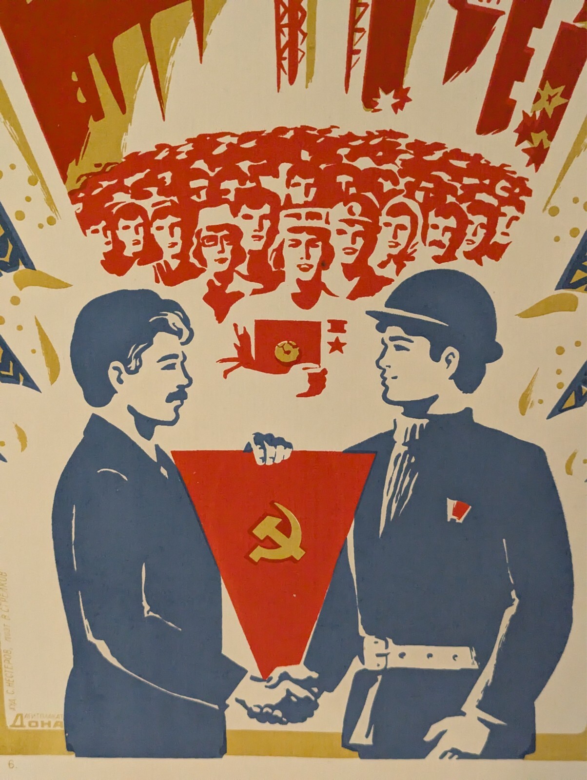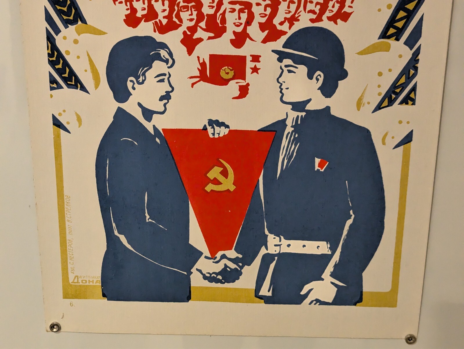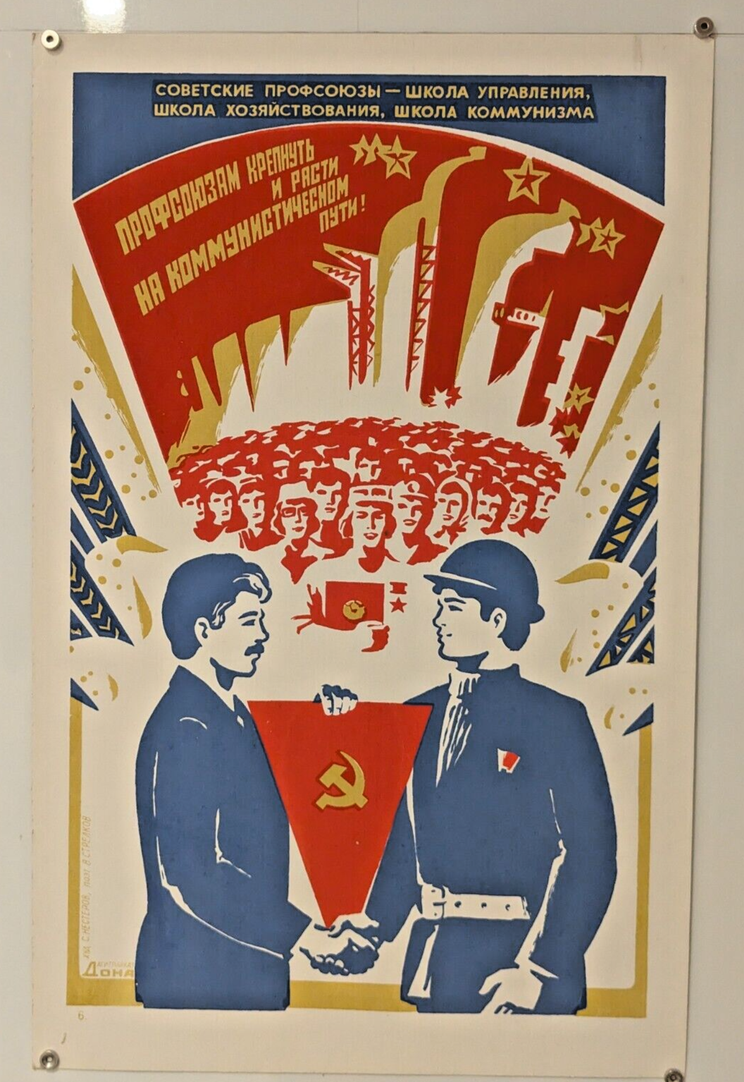 Welcome to Antique Poster Shop The poster is one of the most lively and, at the same time, the most complex areas in graphic design, in art. The Soviet poster is a truly unique phenomenon, and in different years the authors of famous posters were outstanding Soviet artists, leading people of their time. The best artists of their time worked on propaganda posters, famous poets wrote slogans - thus, unique graphic schools were formed. Nowhere in the world did they teach the poster purposefully and systematically, as it was in the USSR. Rare Soviet posters today have to be searched for in different countries of the world. It's a paradox, but what was created in only a few copies and is known only to collectors is sometimes easier to find than what was produced in thousands of copies. Of the millions of campaign posters that have adorned the streets, classrooms, classrooms and hospital corridors for many decades, only a few have survived. Posters of the Soviet era are not only original works of graphic art, antiques and antique graphics, original retro gifts and interior items, but also truly historical documents. ___________________________________________________________________________ The poster is created using the technique of multi-color silk-screen printing, stencil type. An extremely rare type of poster creation since each copy is made by hand. The stencil is also made by hand. Such posters are produced in extremely small print runs _________________________________________________________________________________________________________ SLOGAN : Hold proudly the Banner of Soviet trade unions! Type of printing : Silk-screen printing Publishing house : creative association "Agitplakat Dona" Year of creation : 1972 SIZE – 22 / 14 INCHES OR 56 /36 CENTIMETERS THE PAINTER IS : Shutenko Rodion 1921 Biography Soviet and Russian graphic artist, poster artist, caricaturist. Member of the Union of Artists of the USSR. Worked as a caricaturist in the satirical magazine "Krokodil" and in the creative association "Agitplakat Dona". Participant in the Great Patriotic War. Rodion Stepanovich served in the artillery regiment of the 315th rifle division. Commanding a howitzer battery, Rodion Shutenko fought the Nazis at Stalingrad, liberated Crimea. The division's soldiers not only fought for Stalingrad, but also liberated Shakhty and Novoshakhtinsk, fought on the Mius. Moreover: five brothers of Rodion Stepanovich fought on the front lines. And they all returned home alive! Now he paints pictures about the Great Patriotic War, including this decisive battle. A former artilleryman, the 97-year-old artist and poet considers his work about Stalingrad to be a valuable work - after all, on the burnt sheet there are signatures of Rostov residents who took part in the defense of Stalingrad. Many of them are no longer alive. Senior Lieutenant Rodion Shutenko returned to his home in his native village of Oblivskaya after being discharged into the reserve in 1946. And the following year he entered the Rostov Art School named after M. B. Grekov. Since childhood, I was sure: I will become an artist - or nobody! And since my last name is "joking", I was initially drawn to the genre of caricature. While still studying at the "Grekovka", I began to establish contacts with the incredibly popular humorous magazine "Crocodile" in the Soviet years, - said Rodion Stepanovich. At first, the Rostov resident sent themes for caricatures to the editorial office of "Crocodile". They responded kindly to him: "You lack humor," or "You failed to develop the plot." But the persistence of the young cartoonist gradually prevailed. Shutenko's themes began to be accepted for publication, although they were drawn by more experienced, full-time artists of "Krokodil." During the summer holidays, Rodion came to Moscow, rented a corner for the night somewhere not far from the editorial office, and came there every day as if to work. In the end, Rodion Shutenko became a freelance author of "Krokodil." They already paid for his travel from Rostov, and provided a hotel in Moscow. Once a week, so-called "dark" meetings were held, to which all the artists collaborating with "Krokodil" were invited, R. S. Shutenko continues his story. The freelancers brought their sketches and drafts, drawn anywhere, on pieces of paper or cardboard. The main thing was to explain their idea and show its vision on paper. If the theme was accepted, it was ordered from one of the staff artists of "Krokodil". These were famous masters of caricature, each with his own established style and style. "International" themes of Shutenko were most often sent to the creative team of Kukryniksy, other themes of the young artist usually went to another famous "Krokodil" - Yuli Abramovich Ganf, or a native of the Don Nakhichevan Leon Georgievich Gench. After graduating from the "Grekov" school, Rodion Shutenko received a teacher's diploma and was sent to work as a drawing teacher at a school for hearing-impaired children on Suvorov Street. But in 1962, the artist changed his teaching activity to professional activity as an artist. Even working as a teacher, I continued to draw, participated in exhibitions of the Union of Artists and did not break off contact with the magazine "Krokodil", where I went during the summer holidays. He achieved some success, and one day the young cartoonist was invited to his studio by Anatoly Mosin, an artist for the literary magazine Don and head of the graphics section at the Rostov branch of the Union of Artists of Russia. At 16 Turgenevskaya Street, Rostov graphic artists Viktor Dorokhov, Arsen Mardirosov and the Kondratyev brothers, who had also been invited by Mosin, were already sitting there. “Mosin announced to us his plan to create a creative association in Rostov called “Agitplakat Dona”. Such an association had recently been created in the capital. And the prototype was the famous “Windows of Satire ROSTA”, where Vladimir 