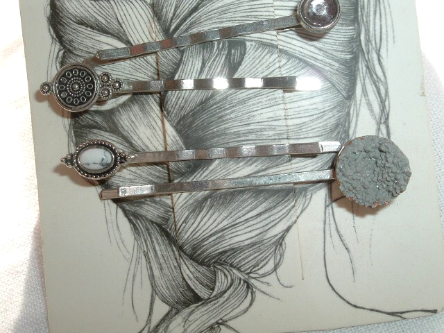 Four new silvertone bobby pins with grey rhinestones, grey clay and silver measuring 2". All new, never worn, they are all in excellent condition. We combine ship