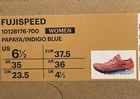 The product is a pair of ASICS Fuji Speed women's running shoes in size 6.5. They feature a red color with Nexkin upper material and come in a papaya indigo blue design. The shoes are suitable for activewear and casual occasions, with a sneaker style and athletic type. The model is ASICS Fujispeed from the ASICS Fuji product line.