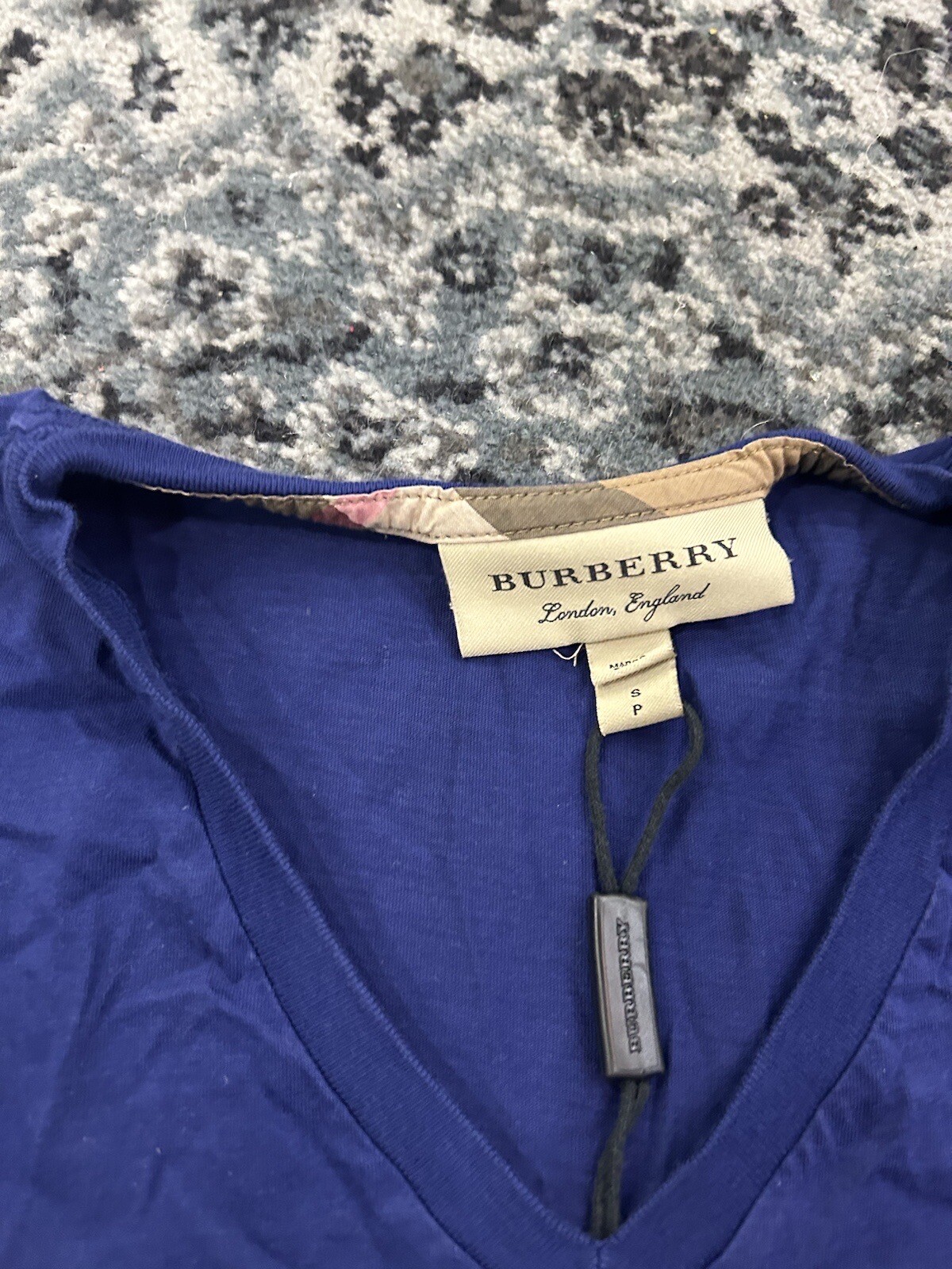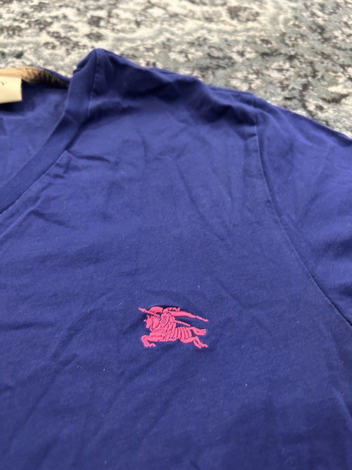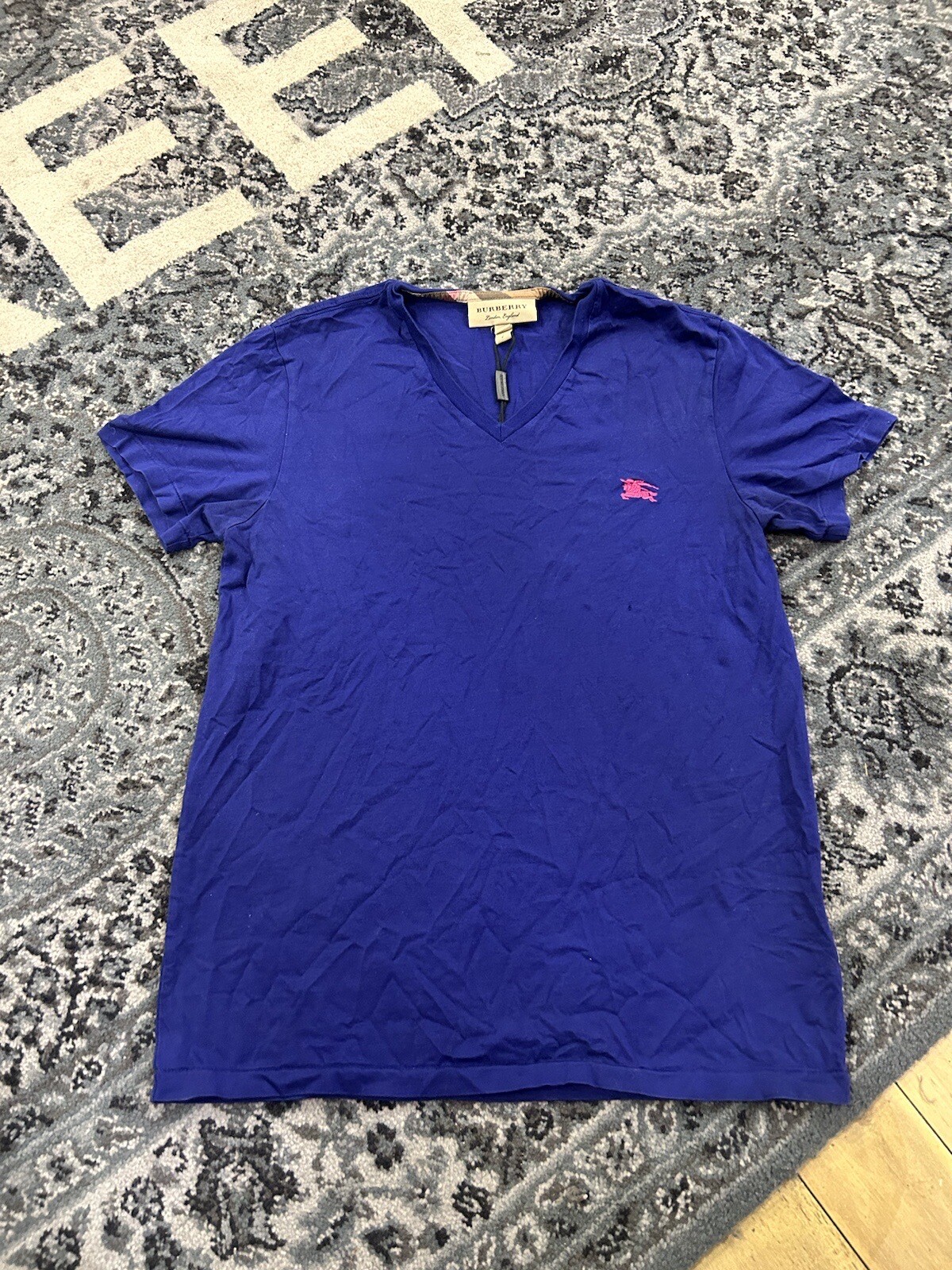 Small Blue Burberry V Neck T Shirt. Pre Owned 7/10 Used Condition. Light Wear On Front And Back. See Pics For More Details. Shipped with USPS Priority Mail.