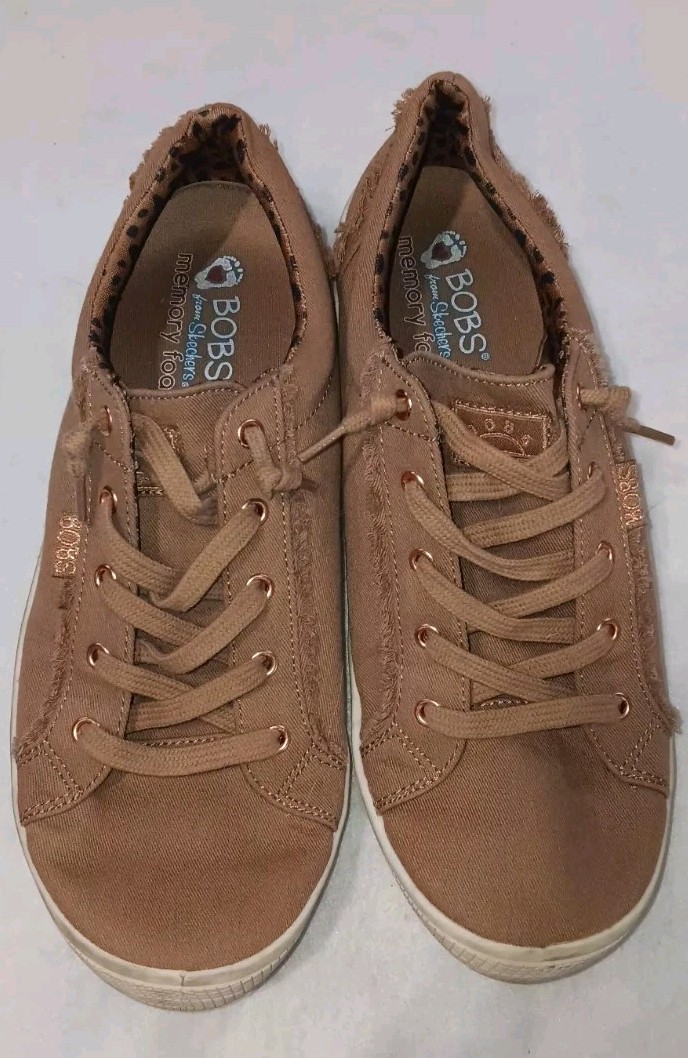 The Sketchers Bobs B Extra Cute Canvas Fray Sneakers in women's size 9 are a stylish and comfortable choice for casual wear. Featuring a brown leopard print design, these sneakers are made with a canvas lining and upper material, with a B shoe width for a comfortable fit. The Sketchers brand and Bobs model ensure quality and a trendy look, making them a great addition to any woman's shoe collection.