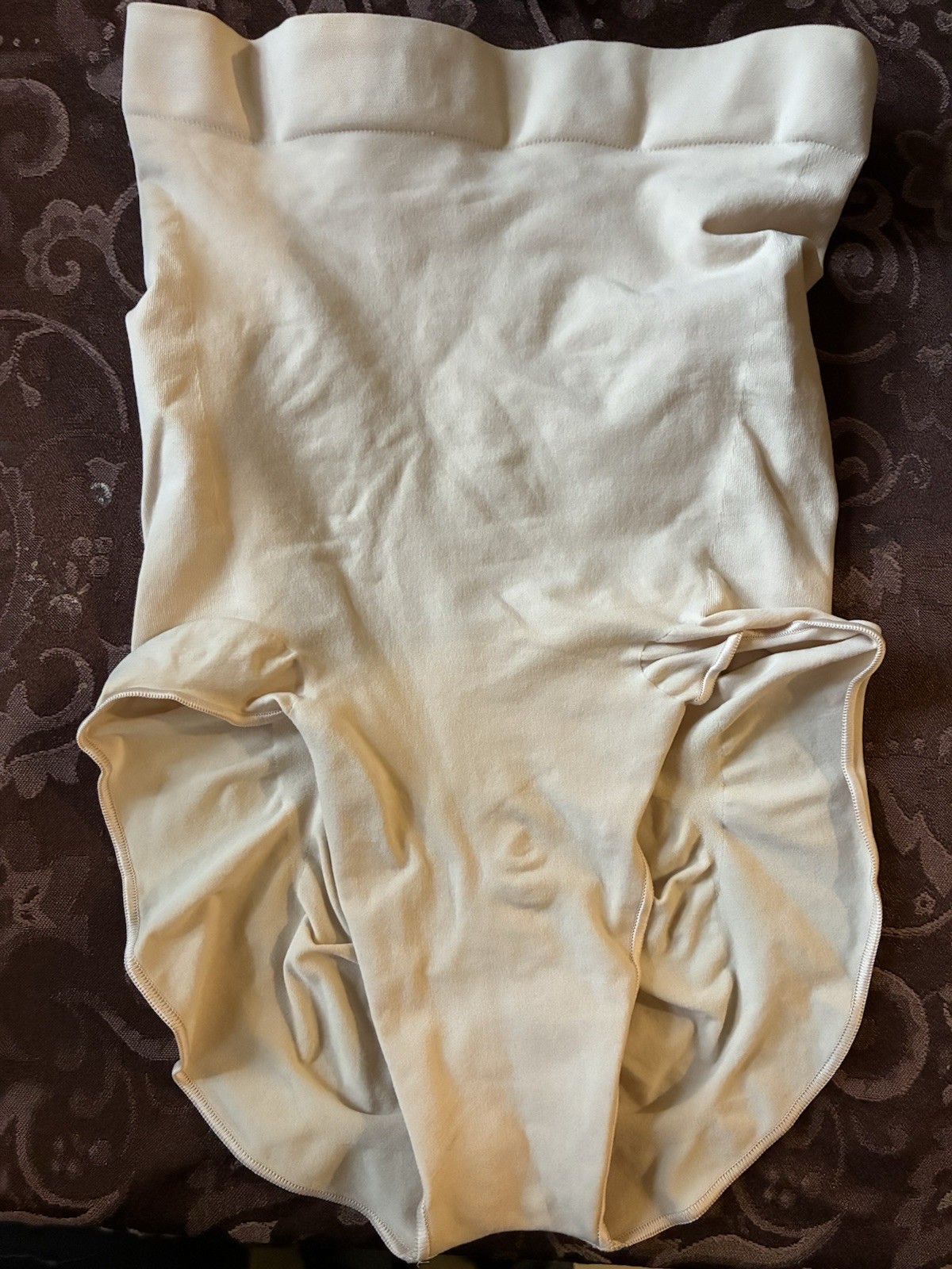 The shapewear shown is the SKIMS Seamless Sculpt High-Waisted Brief. It is designed to hit right below the bust for maximum coverage and features strong, targeted compression to shape and sculpt the tummy and waist. Product Details Brand: SKIMS Style: High-Waisted Brief Material: Made from a blend of nylon and elastane for a stretchy fit. Features: Includes an interior silicone underband to prevent rolling and has butt-shaping pockets to lift and define. Support Level: Strong compression for shaping and sculpting