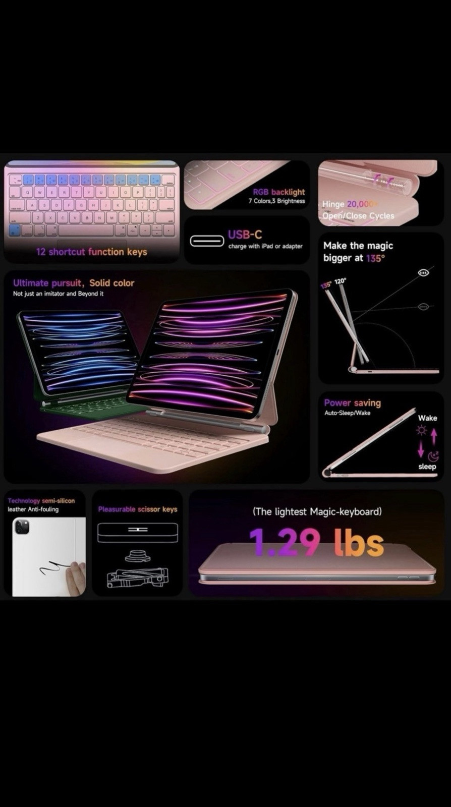 HOU Keyboard Case for iPad Air 11 inch 2024 (M2)&iPad Air 5th Generation Case with Keyboard(Air 4th),iPad Pro 11 Inch (4th/3rd/2nd/1st) Gen 2022,Magic-Stand,AG Glass Trackpad,7 Colors Backlight, Pink Compatibility The only compatible with iPad Air 11 inch 2024 (M2)& iPad Pro 11 inch (4th/3rd/2nd/1st gen) & iPad Air 10.9 “(5th/4th gen), models include 2022 11 inch Pro 4th Ge (A2759,A2435,A2761,A2762), 2021 iPad Pro 3rd Gen (A2301, A2456, A2460), 2020 iPad Pro 2nd Gen (A2228, A2068, A2230, A2231), 2018 iPad Pro 1st Generation (A1980, A2013, A1934, A1979), 2022 iPad Air 5th Gen (A2591/A2588/A2589), 2020 iPad Air 4th Gen (A2072, A2316, A2324, A2325). Please check the bottom of your iPad on model number Axxxx before purchasing. Precision Multi-Touch Trackpad 2023 Upgraded full-area click and integrated multi-touch trackpad made by “etching process” and powerful linear motor,allows you accurately control your iPad pro 11 with different gestures such as scrolling, swiping, and tapping,as we
