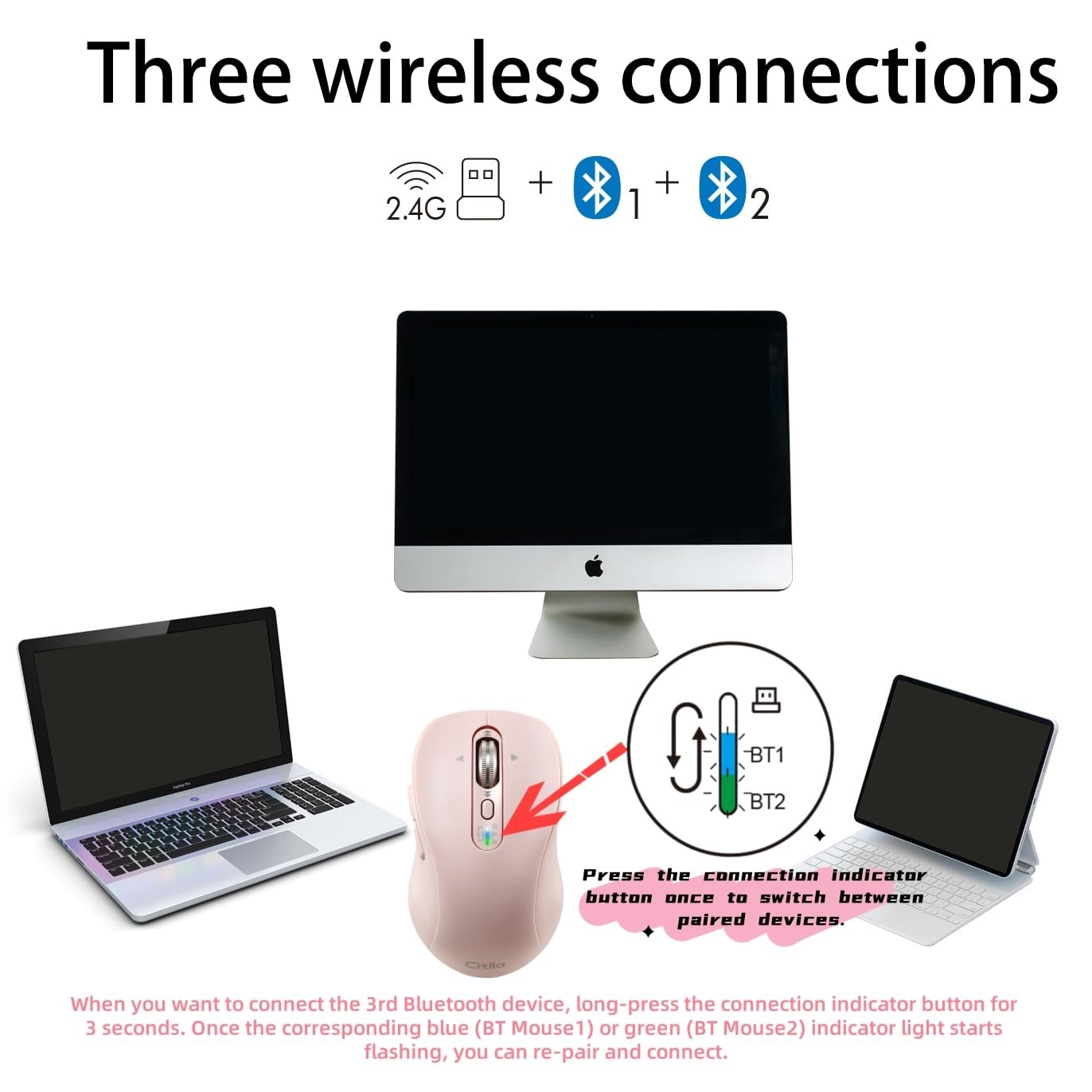 Multi-Device Wireless Mouse – Triple Connectivity, 4-Way Scroll & Adjustable DPI Boost your efficiency with our feature-packed wireless mouse, offering dual Bluetooth + 2.4G USB-A support to connect up to 3 devices simultaneously. Switch effortlessly between your laptop, tablet, and desktop with a single button. Key Features: ✔ 4-Level DPI Adjustment (1000/1600/2400/3000) – Tailor cursor speed to your task, from precision work to fast navigation. ✔ 4-Way Scroll Wheel – Smooth vertical and horizontal scrolling for documents and spreadsheets. ✔ Ultra-Quiet Clicks – Noise-reduced buttons ideal for offices, libraries, or late-night use. ✔ Rechargeable via USB-C – Includes a charging cable; 60-day battery life (7-day low-battery warning light). ✔ 4 Stylish Colors – Gray, White, Pink, or Purple to suit any setup. Perfect for: Professionals, students, and multi-device users who demand flexibility, precision, and silent operation. 4 - Way Navigation : The L570 mouse is equipped with a four-way scroll wheel that provides smart fly scroll and horizontal movement, which provides super-fast scrolling speed when you swipe on long web pages, and side press the wheel to allow horizontal scrolling of the entire page, improving your productivity. Precision Control : The wireless mouse offers 4 adjustable DPI settings (1000/1600/2400/3000), enabling you to tailor the speed to your preference. The whisper-quiet buttons ensure a peaceful working environment. Compatibility : Wireless mouse is compatible with a range of devices, including desktops, laptops, tablets, smartphones, all-in-one PCs, and is compatible with various operating systems (Windows, Linux, Mac, Chrome, iOS, Android). The L570 mouse seamlessly switches between multiple devices. Reliable Signal Connection : wireless mouse provides a stable wireless signal connection. It's equipped with a 2.4G USB wireless receiver and two Bluetooth channels, which can be allocated to three separate devices or used to establish different connections on a single device.【Note】: The USB-A receiver is inside the mouse. The top cover of the mouse adopts a magnetic design, you can get the receiver by opening the top cover of the mouse. Rechargeable : The mouse adopts a Type-C charging port, and the box contains a Type-C charging cable, which can be used normally for 60 days after charging for one hour. The low power indicator will light up when the remaining power is less than 7 days, and the user has enough time to choose the right time to charge. Silent Cilck : Whether you're working in the office or at home, mute clicks will help you avoid distractions and improve focus, and the classic styling will make it faster and easier to adjust to your new mouse, reducing the chance of unhappiness. Bluetooth:When connecting to a new device using Bluetooth, hold down the device switch key for three seconds, at which point the Bluetooth can be found by the device. Note : On Mac and Windows systems, their default wheel orientation is opposite, so when you encounter a wheel orientation error, please adjust the system switch button at the bottom of the mouse, the mouse will remember the system that the device should use, no need to adjust it repeatedly.