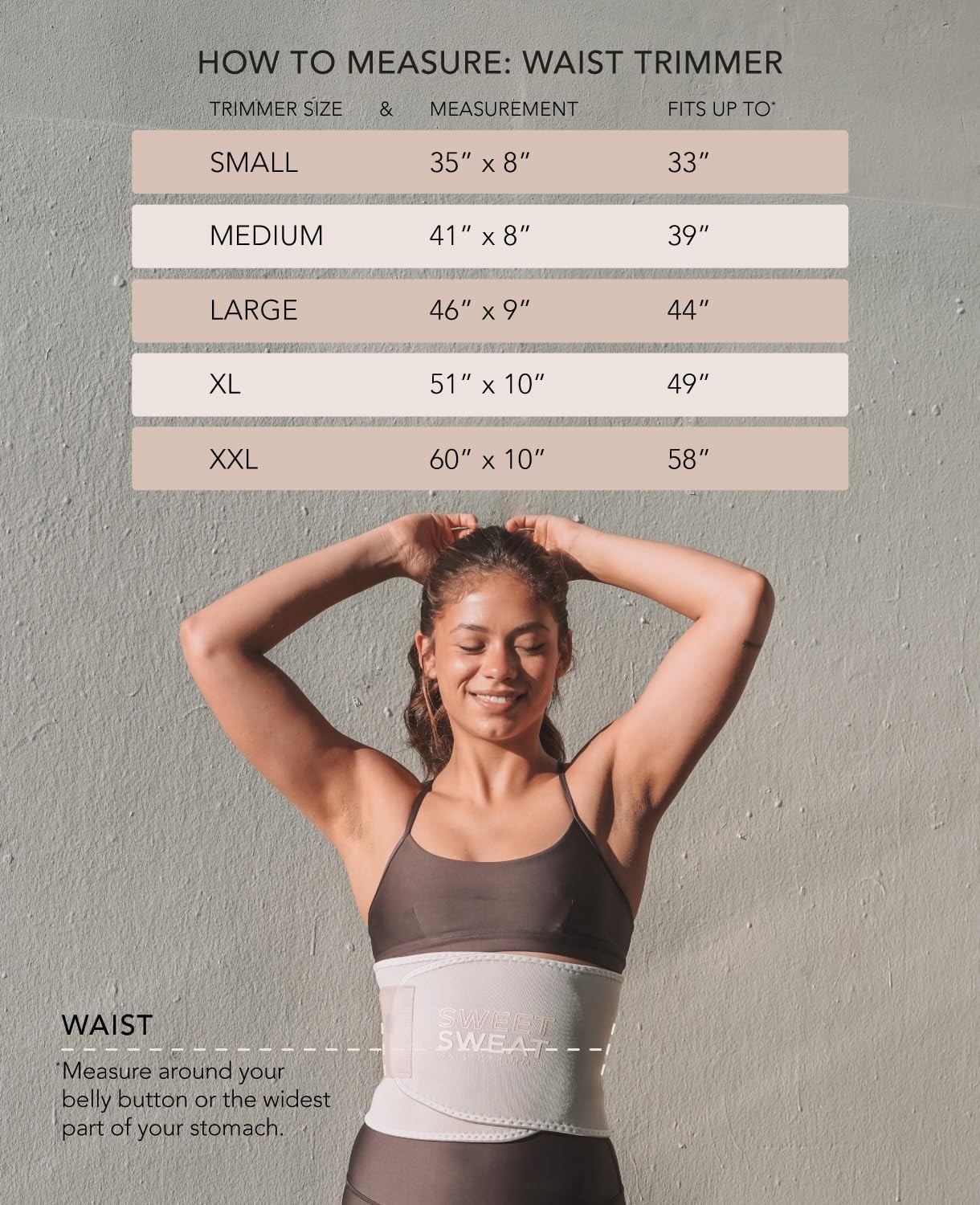 The Sweet Sweat Waist Trimmer in the Toned Collection colorway provides durable, lightweight, and flexible support in diverse flesh-colored tones. Experience Neo-Sweat Technology and the difference that heat insulation to the midsection and back can provide. Available in sizes S-XXL, so you can find the perfect fit. GET TONED | Sweet Sweat 'Toned' Waist Trimmer promotes an additional increase in heat and sweat when used during exercise. FLEXES FOR A CUSTOM FIT | The Sweet Sweat Waist Trimmer is naturally flexible to adjust to your size and shape and contoured to fit around your waist comfortably during exercise. QUALITY | Made with Extra Thick, latex-free Neoprene for Superior heat insulation. The trimmer's grid inner lining prevents moisture absorption & will minimize slipping/bunching during your workout. SWEET SWEAT | For best results use Waist Trimmer in combination with Sweet Sweat 'Workout Enhancer' Gel (not included). SIZING | S (35" Length x 8" Width) - M (41" Length x 8" Width) - L (46" Length x 9" Width) - XL (51" length x 10" width) - XXL (60" length x 10" width)