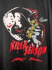 Get ready to show off your love for slasher films with this Sneaker Threads Friday 13th Jason Kills Season T-Shirt. Featuring a classic crew neckline and short sleeves, this black cotton tee is perfect for any casual occasion. The shirt is machine washable for easy care and features a regular fit for comfort. This men's 4XL t-shirt is a must-have for any fan of the iconic horror franchise. The shirt is made in the United States and features the iconic Jason Voorhees character family. Whether you're going to a horror movie screening or just hanging out with friends, this t-shirt is perfect for any occasion.
