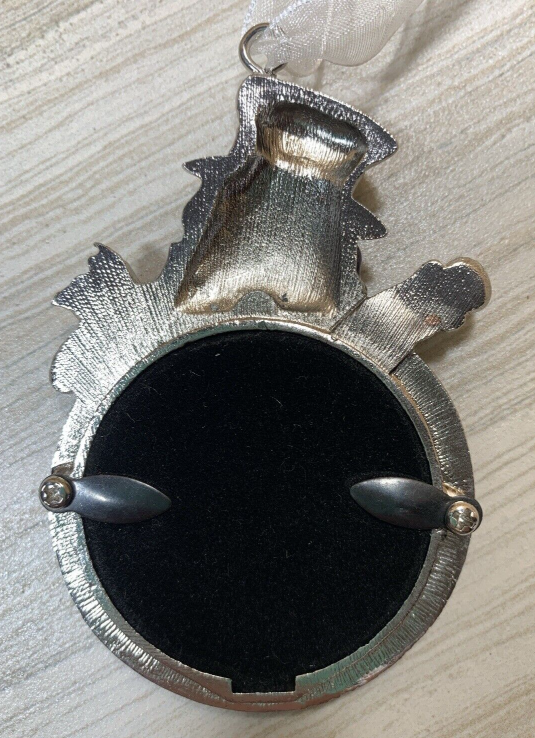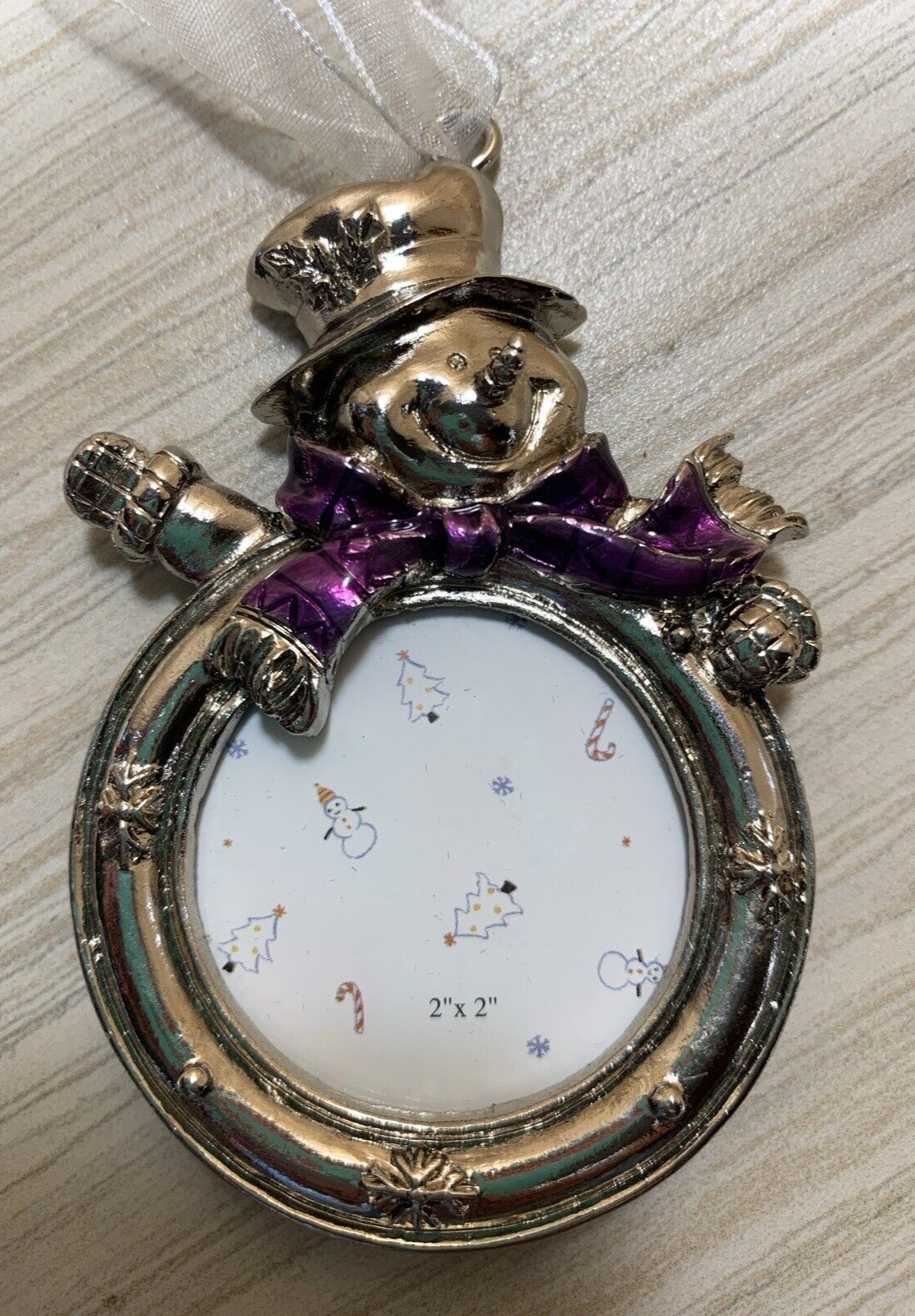 Snowman Round 1 1/2" Photo Frame Ornaments Colored Scarf Silver Snowmen Set of 3. These are new in the box but the box has been opened and there are some small dents in the box from storage. Each ornament holds a photo that is approximately 1 1/2" in diameter. Please see all photos as they are part of the description. We try to list as many details as possible, however some items are vintage and pre-owned so flaws are to be expected. We try to find out as much information as possible on each item we have available. On occasion we may make a mistake and appreciate your feedback.