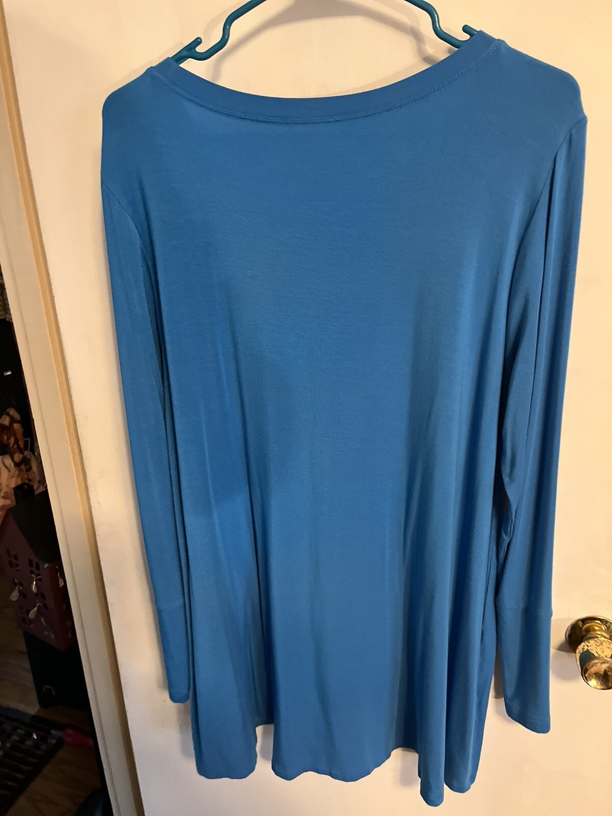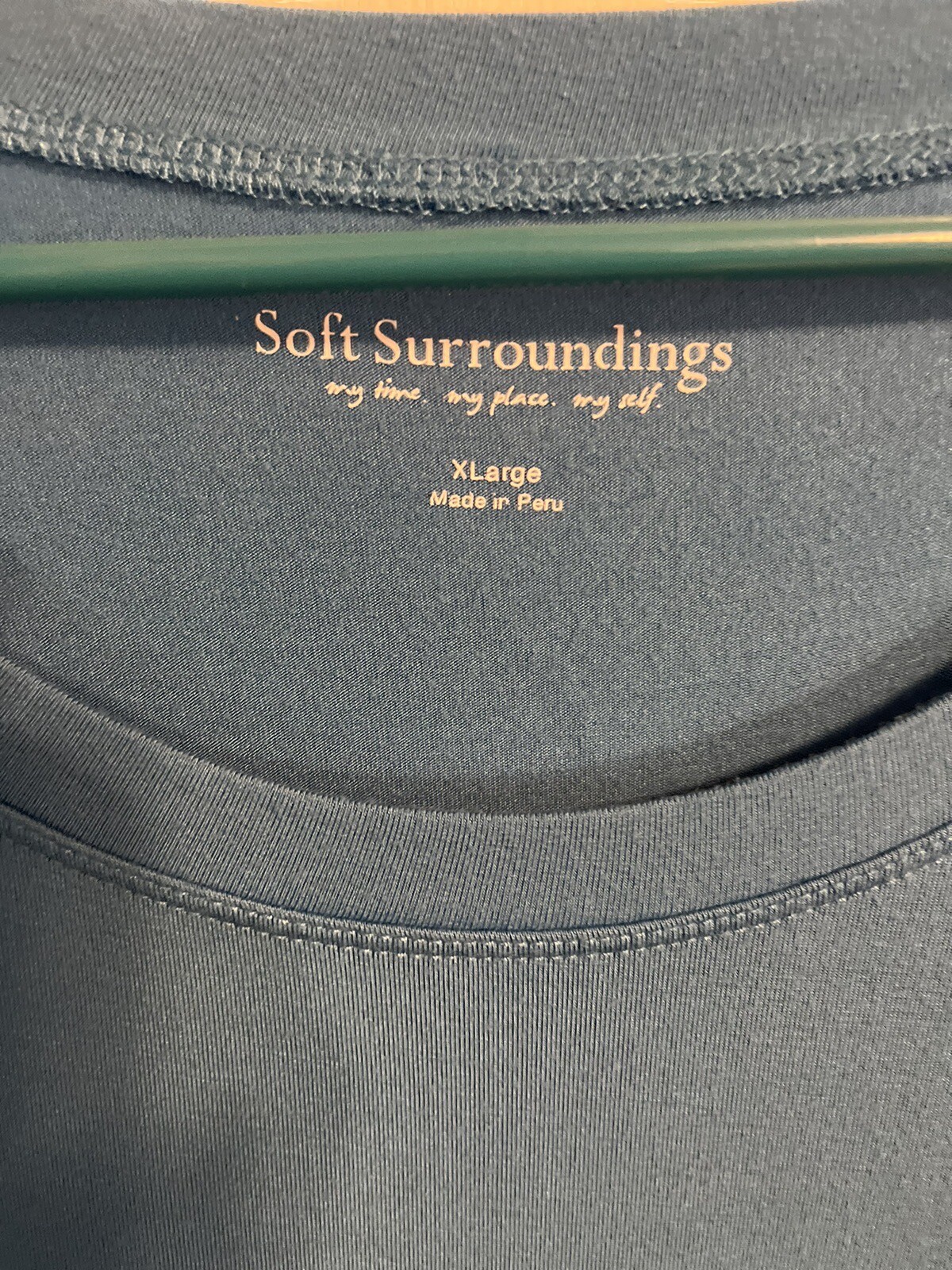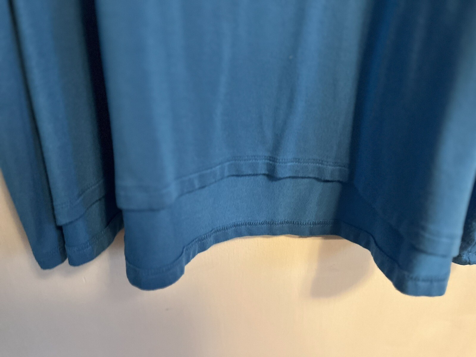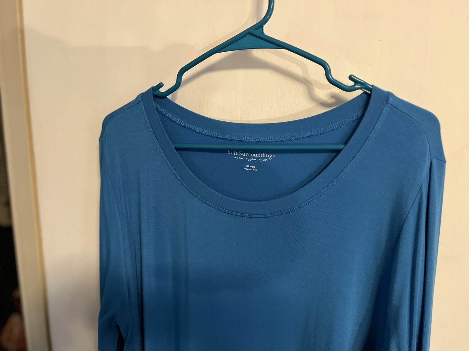 Soft Surroundings EXCELLENT PREOWNED CONDITION Women's TOP MEASURES APPROXIMATELY 33" IN OVERALL LENGTH Pullover Tunic Top Teal 21" TO ARMPIT LYING FLAT Asymmetrical SLEEVE LENGTH 25 " LENGTH 5 SMALL BUTTONS ON EACH SLEEVE AREA Size XL CLOTHES COME FROM A NON-SMOKING, PET FREE HOME. THANKS FOR LOOKING, HAVE ANY QUESTIONS, PLEASE ASK.