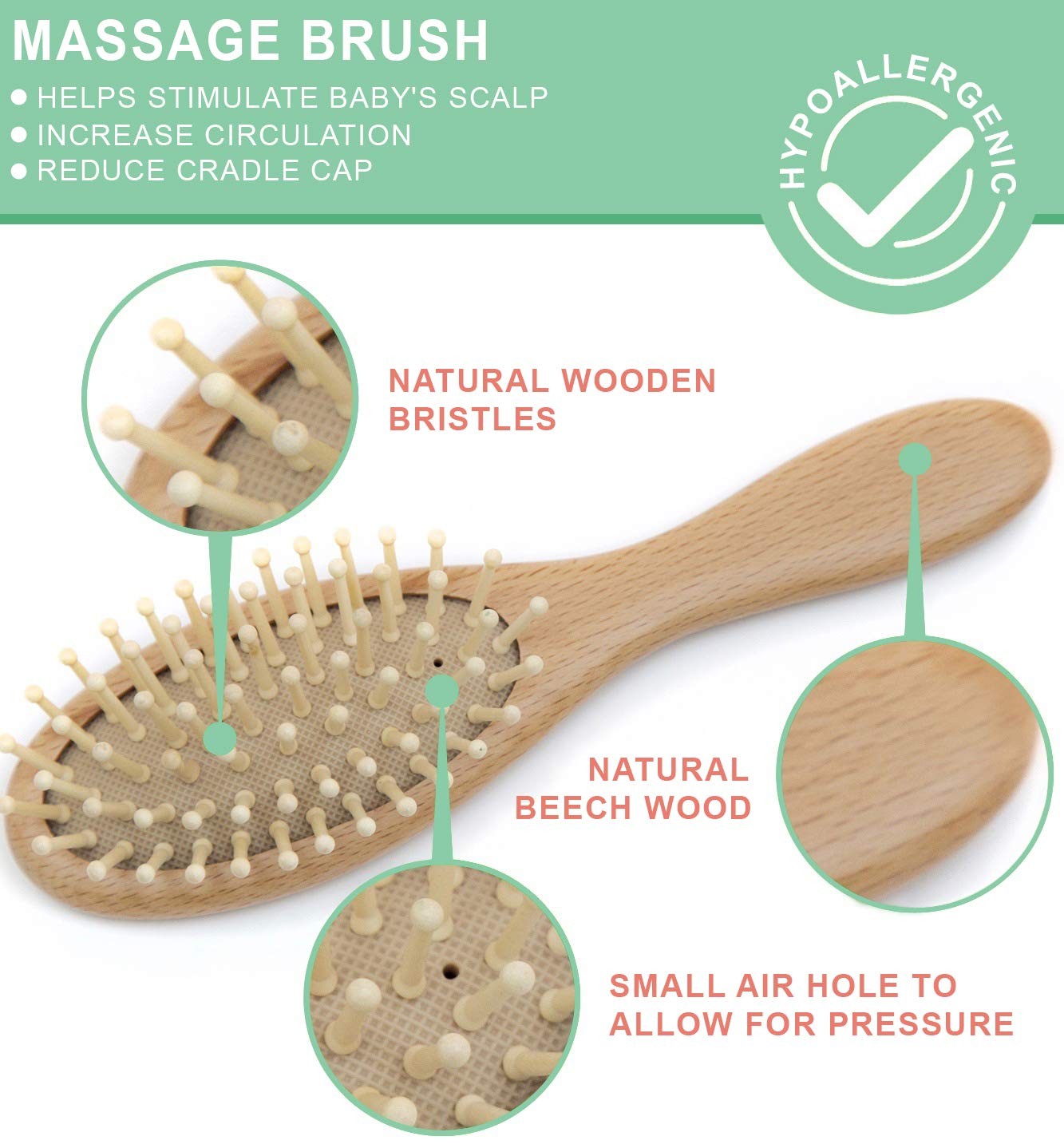 The Simple Solution For Healthy Cradle Cap Free Baby Hair _ The Most Complete Baby Hair Brush Set. If youÍre looking for a safe and soft brush to keep your baby's scalp clean and their hair groomed then you've found it! This set of 4 Baby Brushes has everything you need to groom and clean your baby's hair while ensuring they stay comfortable and happy! The Wooden Baby Hair Brush & Comb Set contains a soft scalp brush for baby that has 100% natural goat's hair bristles that is ultra-soft, along with a Baby Comb, which is just the right size for your baby! Cradle Cap is A Real Problem - We Have The Solution - Throughout the first year of a baby's life, they're likely to be affected by cradle cap. It doesn't cause any pain or irritation but rather appears as scaly patches or thick crusts! With the natural soft Goat Bristles Brush & BPA-FREE Silicone Baby Shampoo Brush you can effectively remove cradle cap and prevent build-up! What's Included In The Set: 1 x 100% Goat Hair Soft Brush: Made from high quality solid beech wood and 100% natural ultra-soft goat hair, this baby brush is anti-static and hypoallergenic so that it will not cause any irritation and will help calm and soothe your baby's scalp. 1 x Solid Beech Wood Massage Brush: This baby brush is the perfect way to prevent cradle cap, improve blood circulation and keep your toddlers scalp soft, while grooming its hair at the same time! 1 x Maple Wood Comb: Normal baby combs cause discomfort to babies when used to untangle knots. This natural baby comb is easy on your baby's skin and helps to untangle your toddler's hair whilst stimulating the scalp for healthier hair.1 x BPA-FREE Soft Silicone Brush: This safe and soft silicone brush is perfect for washing your baby's hair and skin in the most soothing way possible! CLICK ON THE ADD TO CART BUTTON TO ORDER YOURS NOW! baby comb and brush set boy ESSENTIAL BABY CARE: This baby brush and comb set for newborns designed to care for your baby's delicate hair and scalp includes 4 essential tools. A luxuriously soft bristle baby brush, wooden massage brush, wooden baby comb, and gentle silicone baby hairbrush. PERFECT GIFT: This charming wooden baby comb and brush set girl, boy, newborn hair brush is the ideal baby shower present. With its beautiful gift box it also makes a delightful toddler brush and comb set - the perfect infant hair brush set! PREVENTS CRADLE CAP: The gentle soft bristle baby hair brush and comb part of our newborn brush and comb set, helps prevent cradle cap buildup, use as a baby hair scrubber ensuring your baby's delicate scalp stays healthy and comfortable. SAFE ALL NATURAL CARE: Wooden baby brush set made from high quality solid beech wood and 100% natural ultra-soft goat hair, this baby hair comb and brush set is anti-static and hypoallergenic to help calm and soothe your baby’s scalp. FREE BONUS GIFT: The BPA-FREE silicone massage baby cradle cap brush can be used for moisturising and detangling your babys hair without causing any discomfort and helps to remove and prevent cradle cap! Can be used as a baby hair wash brush.