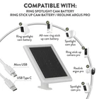 Solar Panel Charger (2nd Generation) for Ring Camera Stick Up Cam Pro, Spotlight Cam Plus, Spotlight Cam Pro,Stick Up Cam Battery, Ring Spotlight Cam Battery,Waterproof, 5W Fast Charging Solar Panel Charger (2nd Generation) for Ring Camera Stick Up Cam Pro, Spotlight Cam Plus, Spotlight Cam Pro,Stick Up Cam Battery, Ring Spotlight Cam Battery,Waterproof, 5W Fast Charging Works with Stick Up Cam, Stick Up Cam Pro, Spotlight Cam Plus and Spotlight Cam Pro using the built-in USB-C connector. Includes with 3 different cable connector Micor usb & Usb-C & Barrel Plug Connector, can rechargeble for 98% outdoor wireless Security camera to Barrel Plug Adapter for backwards compatibility with Ring Stick Up Cam (2nd and 3rd Generation) and Spotlight Cam Battery. Fast Charging Solar Panels for Ring Stick Up Cam / Ring Spotlight Cam Battery / Spotlight Cam Plus / Spotlight Cam Pro /Outdoor Wireless Security Camera,Just a few hours of sun exposure,No more battery changing needed!
