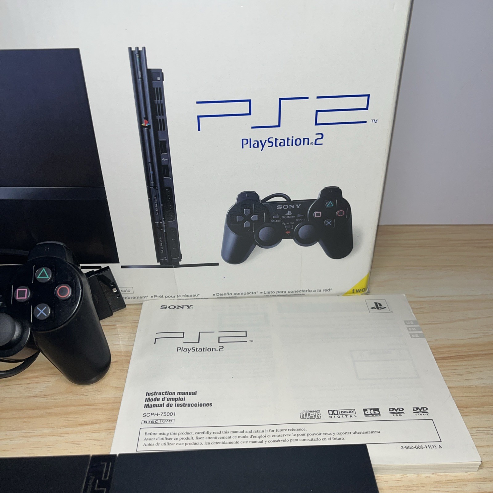 Sony PlayStation 2 Slim SCPH-75001 Console W/Box, Manual, Controller Parts READ Contoller works With two Cables Manual and box Powers on Console is Clean —-Doesn’t read discs——