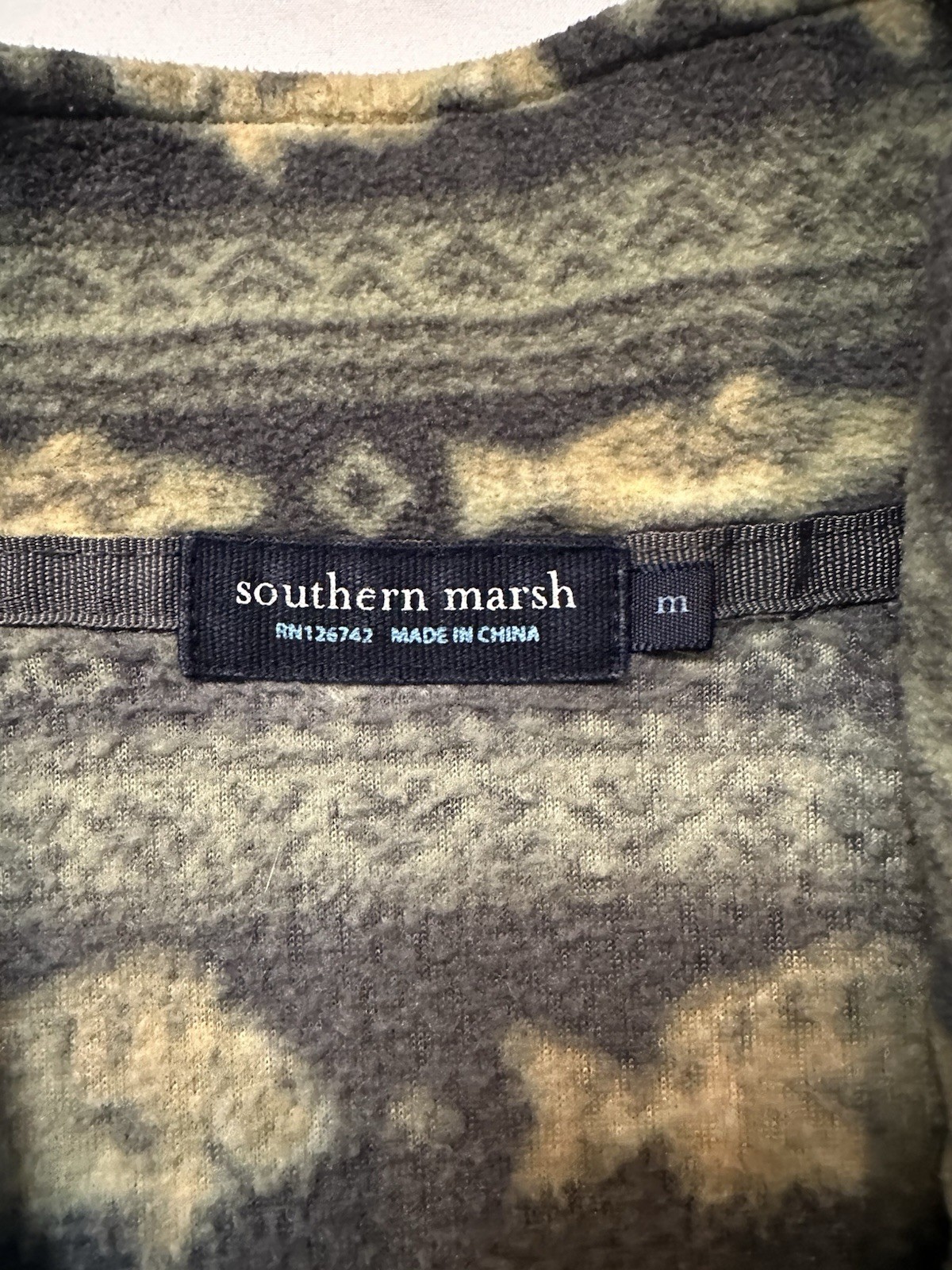 The Southern Marsh Men’s Quarter Zip Pullover is a stylish and comfortable sweater perfect for casual occasions. Features a Fish Outdoor design in a green and tan color way. Made from polyester fleece, this pullover features a mock neck and long sleeves, ideal for the winter, fall, and spring seasons. This piece is super soft to the touch. The regular fit and pullover style make it easy to wear, while the logo accents add a touch of personalization. Machine washable for easy care, this sweater is a versatile addition to any man's wardrobe. This item does have one small tear in the seam around the waist line. Only about an inch wide. Nothing noticeable when wearing (see last picture) Please see pictures for details and precise measurements.
