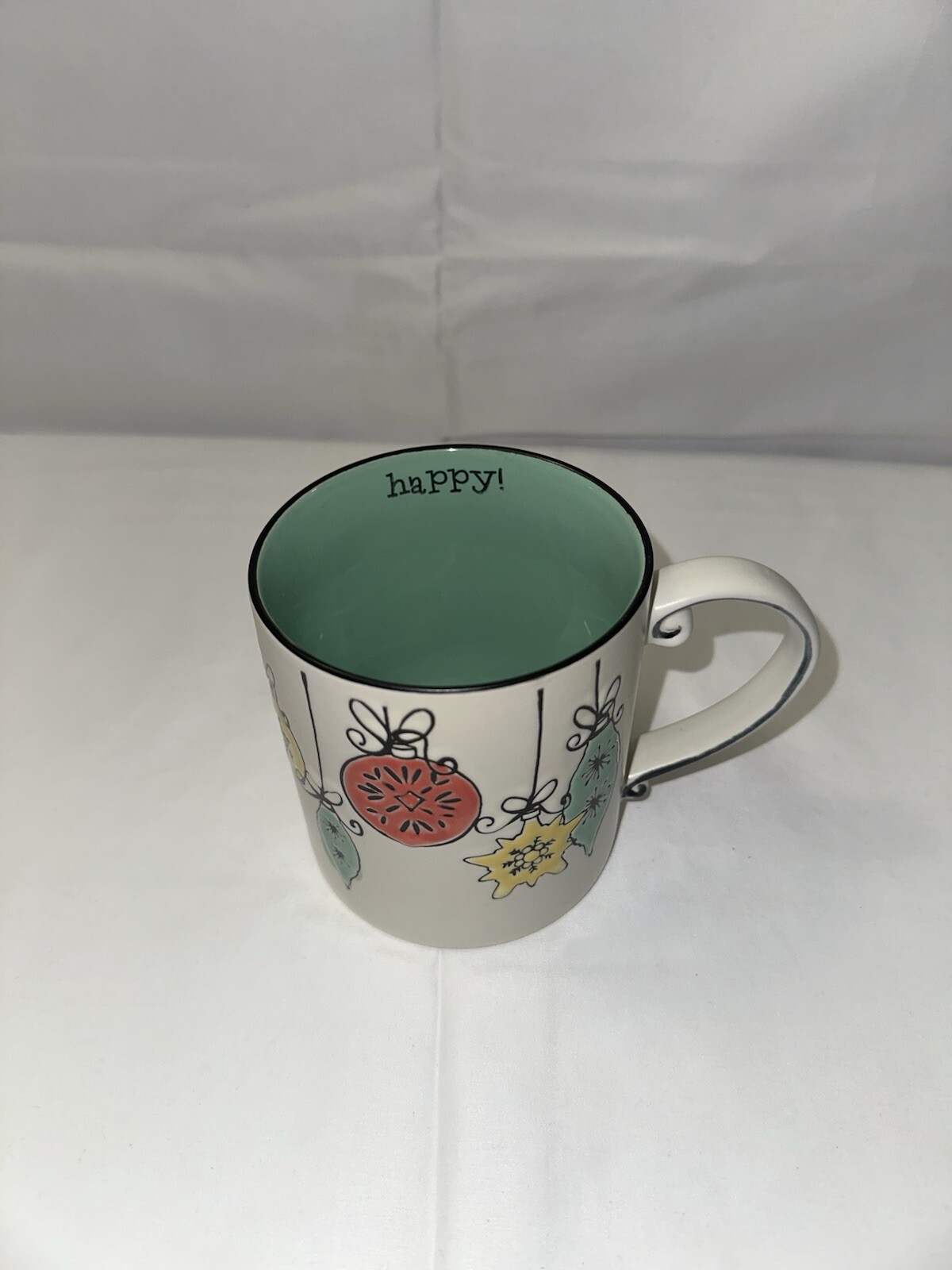 The Spectrum Designz 'Happy' Mug is a large ceramic coffee cup featuring round Christmas ball ornaments with an embossed and painted design. Manufactured in 2017, this 20oz mug is decorated in a multicolor all-over pattern, making it a festive addition to your holiday collection. Dishwasher and microwave safe, this contemporary mug is a cheerful choice for enjoying hot or cold beverages during the Christmas season.
