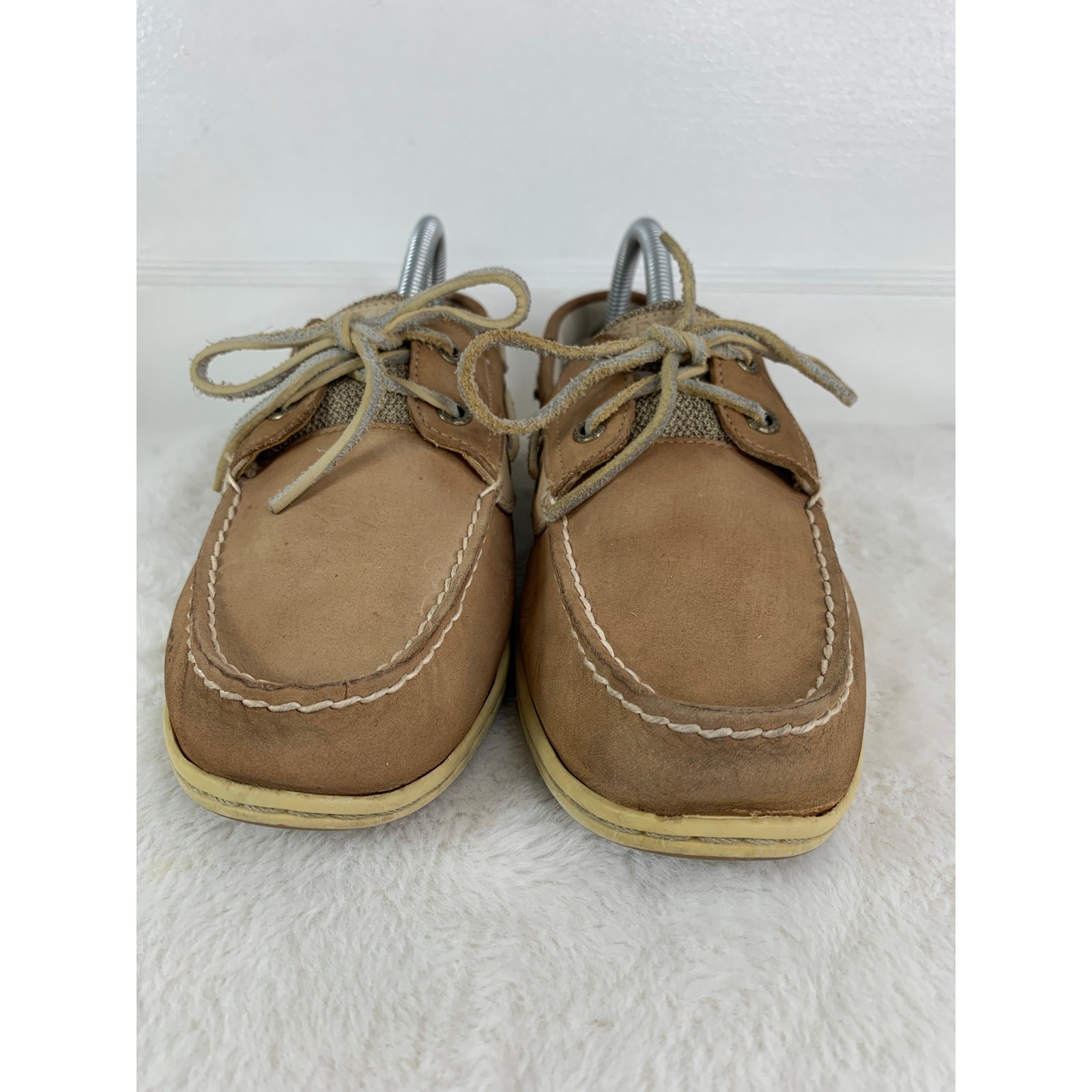 Sperry Top-Sider Angelfish boat shoes in tan leather, women’s size 10 (style STS 95588). These classic lace-up boat shoes offer a timeless preppy look with a durable outsole and comfortable leather upper—great for casual wear or nautical style. These shoes are USED and show signs of wear consistent with regular use—such as minor scuffs and some outsole wear. Refer to all photos for the most accurate representation of the item’s condition.