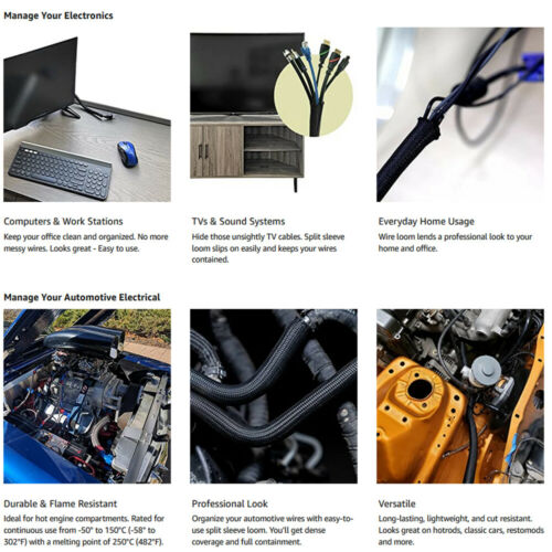 morethink , as an expert in the field of cable management,insist on providing customers with the top quality wire management products. Our cable management is used to wrap and protect wires & organize cables & hide and conceal wires in many application, e.g. Automotive,electronics, home and office etc. What is it used for? Braided wire loom helps protect and organize your wires, and can be used wherever wires exist. Popular uses include electronic cable management and automotive wire harness containment. How does it work? Split-sleeve design easily slips onto existing wires. Braided PET polyester is somewhat stiff and is resistant to abrasion, cuts, chewing, and heat. Do you have these problems? ⭐Our cable management sleeve is used for Hifi speaker hdmi automotive wires. ⭐Our cord protector keeps cat from chewing cables. Our cable protector is insulated. ⭐ e.g. Use For Automotive,electronics, home and office etc. The "split" design means you could add additional wires later and ensures easy access.Convenient for you to manage the wire. ⭐Our cable management sleeve is used for Hifi speaker hdmi automotive wires. ⭐Our cord protector keeps pets from chewing cables. Our cable protector is insulated. ⭐ e.g. Use For Automotive,electronics, home and office etc. Split Braided Cable Tube Can help you!!! Braided Split Cabling Management Sleeving suitable for various electric insulation The sleeving is split for quick and easy installation.no need to remove harness or remove plugs. 【Expandable & Flexible】- Our wire loom is split and easy to load wires. Once loaded, our braided cable sleeve will close on itself and perfect wire wrap. 【Neat & Tidy】- Say goodbye to cluttered cabling eyesores that are impossible to ignore. Our Split expandable braided cable organizer will keep your wiring setup organized and tangle-free. Ensures that the cables behind remain neat and tidy. Flexible braided material ensures it won't scuff up the room either. 【Adjustable & Easy to Install】- Protective cable covers can be cut to any length to match your organization needs. You do need to ether cut it with a HOT KNIFE to prevent fraying or melt the ends a bit with a lighter after you cut it. 【Convenient & Popular】The split design let wires come out anywhere because of “split”. No need to pass through wire plugs if wires and plugs cannot be separated 【Scope of application】High Quality, Split Braided Cable Sleeving Wrap Perfect for Industrial, Automotive, Household, and Marine Applications.application in wire harness, automatic equipment, railways, general manufacturing industry where wires and tubes need a tough and durable protection. 【Effect】resistant to various abrasions, reduct damage,arrange the harness cable.Prevent Pet From Chewing Cords 【Electrical wire routing solution】Self Wrapping Split Braided Sleeving for cable management (woven mesh tube) is braided by environment friendly polyester monofil. Split Braided Cable Sleeve Wrap are with good flexibility, fire resistance, abrasive resistance and thermal insulation performance. Our cable management sleeve: UL Recognized We are the direct source. We do wholesale for small businesses and manufacturer(s). Please call or send us a message through the eBay messaging system for a quote for wholesale pricing for rolls and bulk orders.