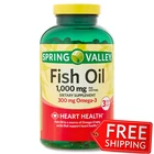 Product details Spring Valley Omega-3 Fish Oil Heart Health Dietary Supplement Softgels are thought to help provide overall support for heart, immune, and bone health.* The soft gels contain 1000 milligrams of omega-3s, 645 milligrams EPA, and 310 milligrams DHA. They are a unique blend of essential fatty acids that may help with heart health and beauty.* The consumption of omega-3 fatty acids may reduce the risk of coronary heart disease.* The omega-3 fatty acids found in fish oil may play important roles in brain function and development.* Pick up Spring Valley Omega-3 Fish Oil Heart Health Dietary Supplement Softgels today. Spring Valley understands living a healthy, balanced lifestyle is the key to being your best self. With an affordable range of products inspired by nature, Spring Valley supports your and your family's health and holistic well-being. Spring Valley Omega-3 Fish Oil Heart Health Dietary Supplement Softgels, 1000 mg, 300 Count May help provide support for heart, immune, and bone health* Unique blend of essential fatty acids May reduce the risk of coronary heart disease* May play important roles in brain function and development* Lemon scented Contains 1000 mg per serving United States coin image from the United States Mint Brand Spring Valley Assembled Product Dimensions (L x W x H) 2.80 x 2.80 x 7.50 Inches Dosage Suggested Use: Adults, take one softgel three times daily, preferably with a meal. Instructions Keep out of reach of children. Store at room temperature 59°- 86° F (15°- 30° C). Keep bottle tightly closed. For your protection, do not use if printed seal under cap is broken or missing.