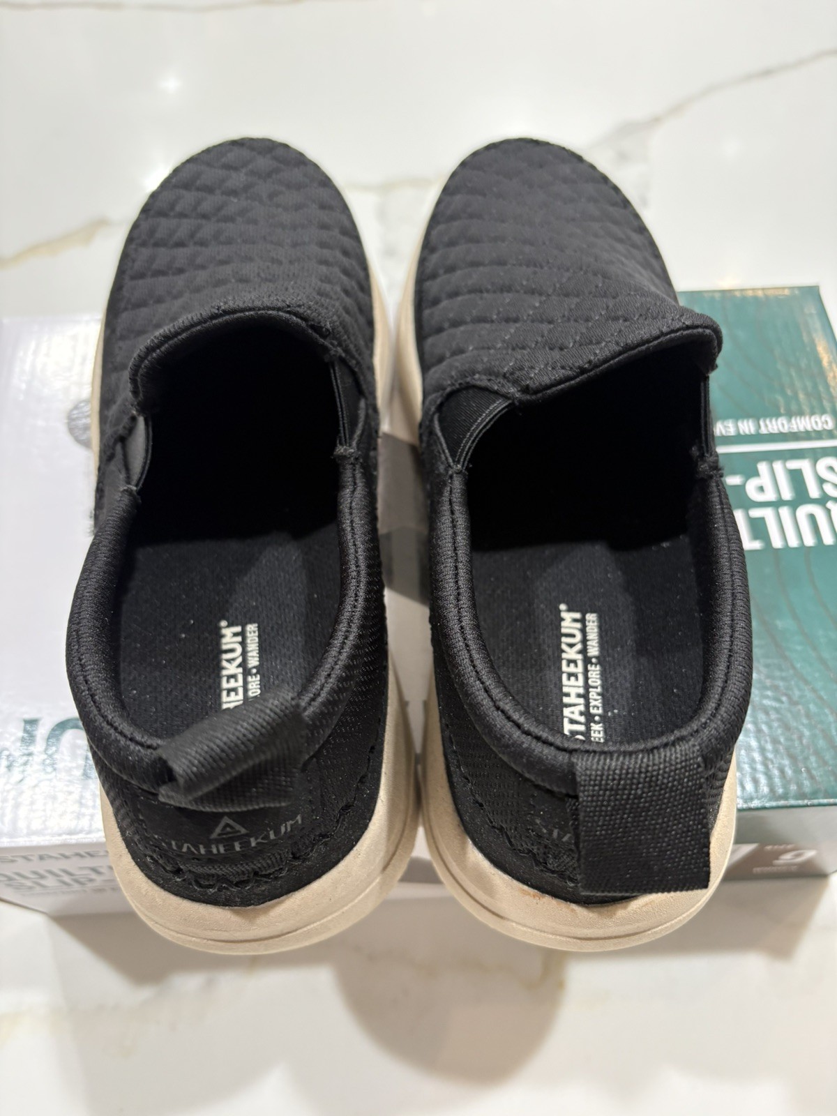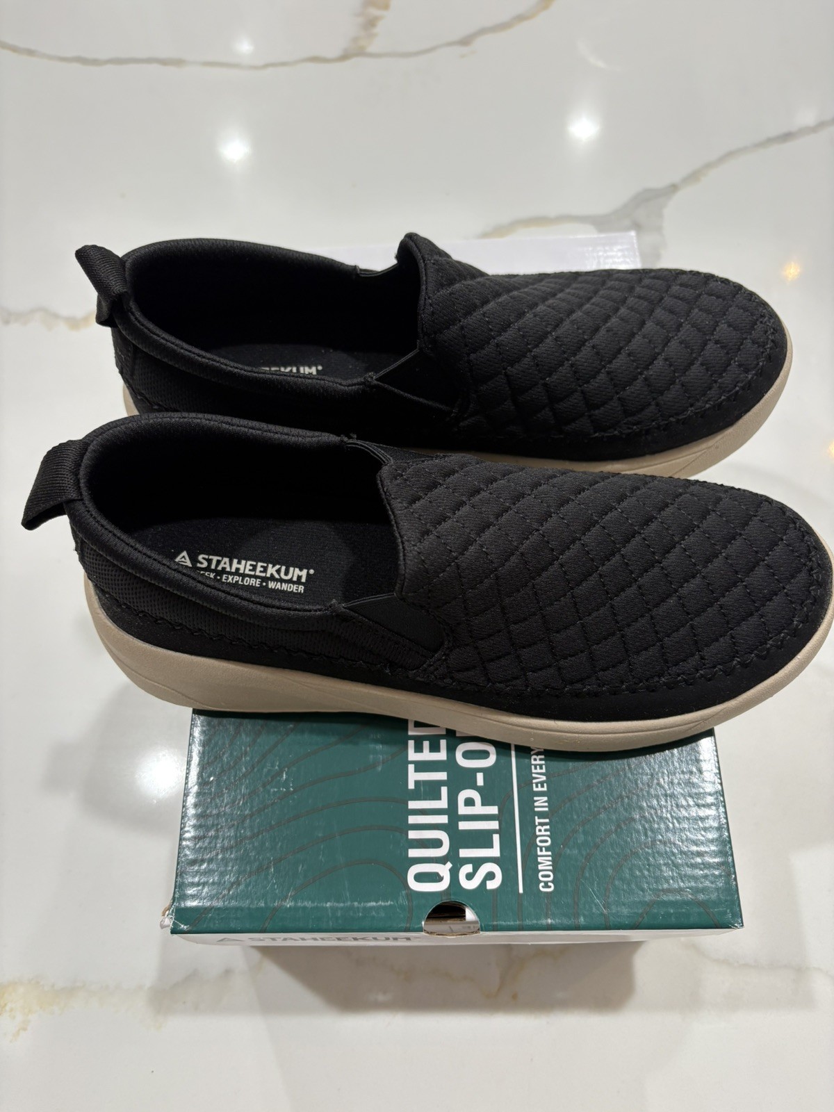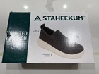The Staheekum Women's Quilted Slip On Shoes in Black, size 9, are designed for casual wear during the fall and spring seasons. These slip-on shoes feature a low-top shaft style with a round toe shape and a flat heel. Made with a breathable mesh upper and a cushioned, lightweight outsole, these comfortable shoes are perfect for walking and everyday activities. The slip-on style and rubber outsole provide easy wear and added durability, making them a practical and stylish choice for women looking for both comfort and functionality in their footwear.