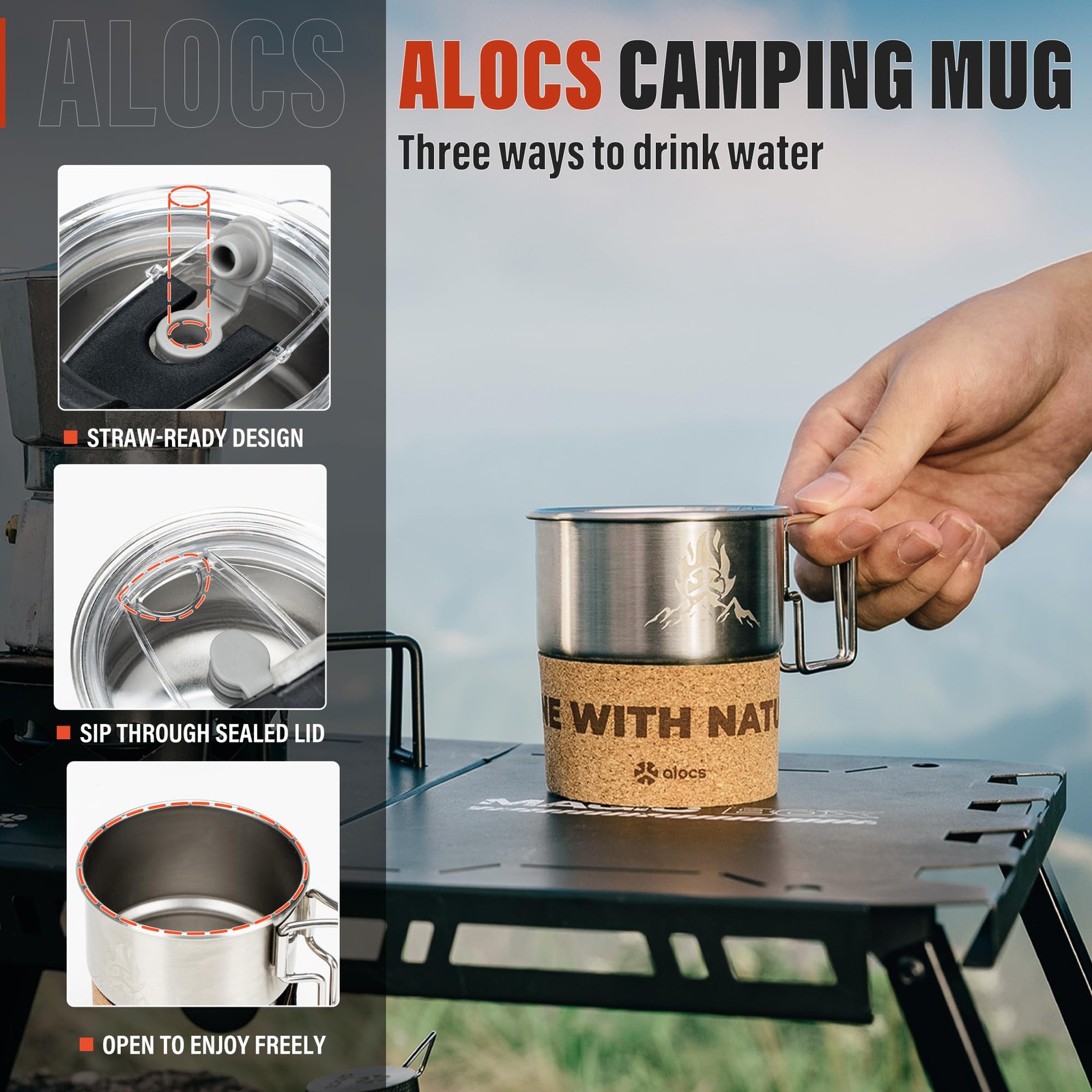 HIGH-QUALITY 304 STAINLESS STEEL – Crafted from rust-resistant 304 stainless steel, travel coffee mug retains no metallic taste while enduring rugged outdoor use. With a smooth interior/exterior finish and lightweight sturdy construction, the stainless steel coffee mug is perfect for hiking, travel, and daily adventures. COMPACT & PRACTICAL – Our camping mug has a capacity of 10.1oz/300ml and measuring 3.07" in diameter x 3.35" in height, this lightweight camping coffee mugs are ideal for coffee, tea or trail snacks. The side-hanging design keeps it conveniently accessible without taking up backpack space. ULTRALIGHT & VERSATILE - Weighing just 107g (3.8oz), this travel mug transitions seamlessly from outdoor adventures to daily routines. Its innovative folding handle provides compact portability while the wide rim ensures comfortable drinking, all maintained with dishwasher-safe convenience. The rugged yet refined design withstands campfire to café use without compromising style or functionality. LEAK-PROOF PROTECTION – The coffee travel mug lid features three silicone seals that working in unison to prevent leaks, keeping beverages securely contained during the adventure. ADVANCED HEAT-SAFE DESIGN - Engineered for ultimate safety, Our camping cup combines a dual-material insulated sleeve (food-grade PU + natural cork) with unique welded handle technology, ensuring burn-free comfort even with boiling drinks. . HIGH-QUALITY 304 STAINLESS STEEL – Crafted from rust-resistant 304 stainless steel, travel coffee mug retains no metallic taste while enduring rugged outdoor use. With a smooth interior/exterior finish and lightweight sturdy construction, the stainless steel coffee mug is perfect for hiking, travel, and daily adventures. COMPACT & PRACTICAL – Our camping mug has a capacity of 10.1oz/300ml and measuring 3.07" in diameter x 3.35" in height, this lightweight camping coffee mugs are ideal for coffee, tea or trail snacks. The side-hanging design keeps it conveniently accessible without taking up backpack space. ULTRALIGHT & VERSATILE - Weighing just 107g (3.8oz), this travel mug transitions seamlessly from outdoor adventures to daily routines. Its innovative folding handle provides compact portability while the wide rim ensures comfortable drinking, all maintained with dishwasher-safe convenience. The rugged yet refined design withstands campfire to café use without compromising style or functionality. LEAK-PROOF PROTECTION – The coffee travel mug lid features three silicone seals that working in unison to prevent leaks, keeping beverages securely contained during the adventure. ADVANCED HEAT-SAFE DESIGN - Engineered for ultimate safety, Our camping cup combines a dual-material insulated sleeve (food-grade PU + natural cork) with unique welded handle technology, ensuring burn-free comfort even with boiling drinks.