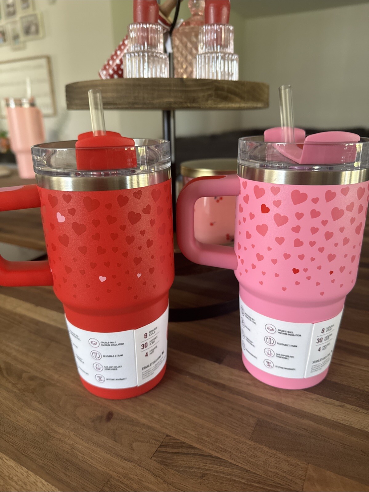 Absolutely love these Valentine's ruby red Stanleys—they're even prettier in person! Perfect size, great grip, and keeps drinks hot or cold for hours. The sweet hearts bundle makes a cute gift or a stylish pair for yourself. No flaws, brand new, and the color is vibrant. Target nailed it with this limited edition release—must-have for Stanley fans!